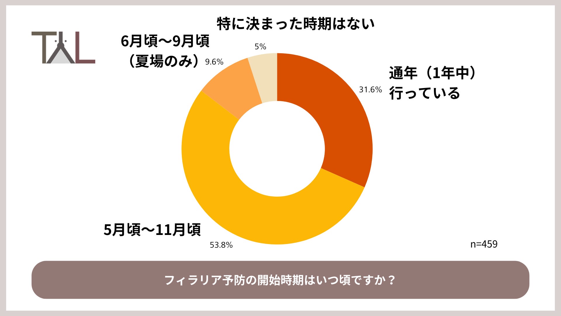 また、Q2で「予防薬を与えていない」または「分からない」と回答した飼い主をのぞく459名の飼い主に対して「フィラリア予防の開始時期はいつ頃ですか?」と質問したところ、「5月頃~11月頃」答えた方が過半数の53.8%で、「6月頃~9月頃(夏場のみ)」(9.6%)と回答した方とあわせて6割以上の飼い主が季節を限定して予防をおこなっていることがわかりました。一方で、フィラリア予防を「通年(1年中)おこなっている」飼い主もは31.6%と、季節を限定した対策をおこなっている飼い主に比べ約半分程度にとどまることがわかりました。