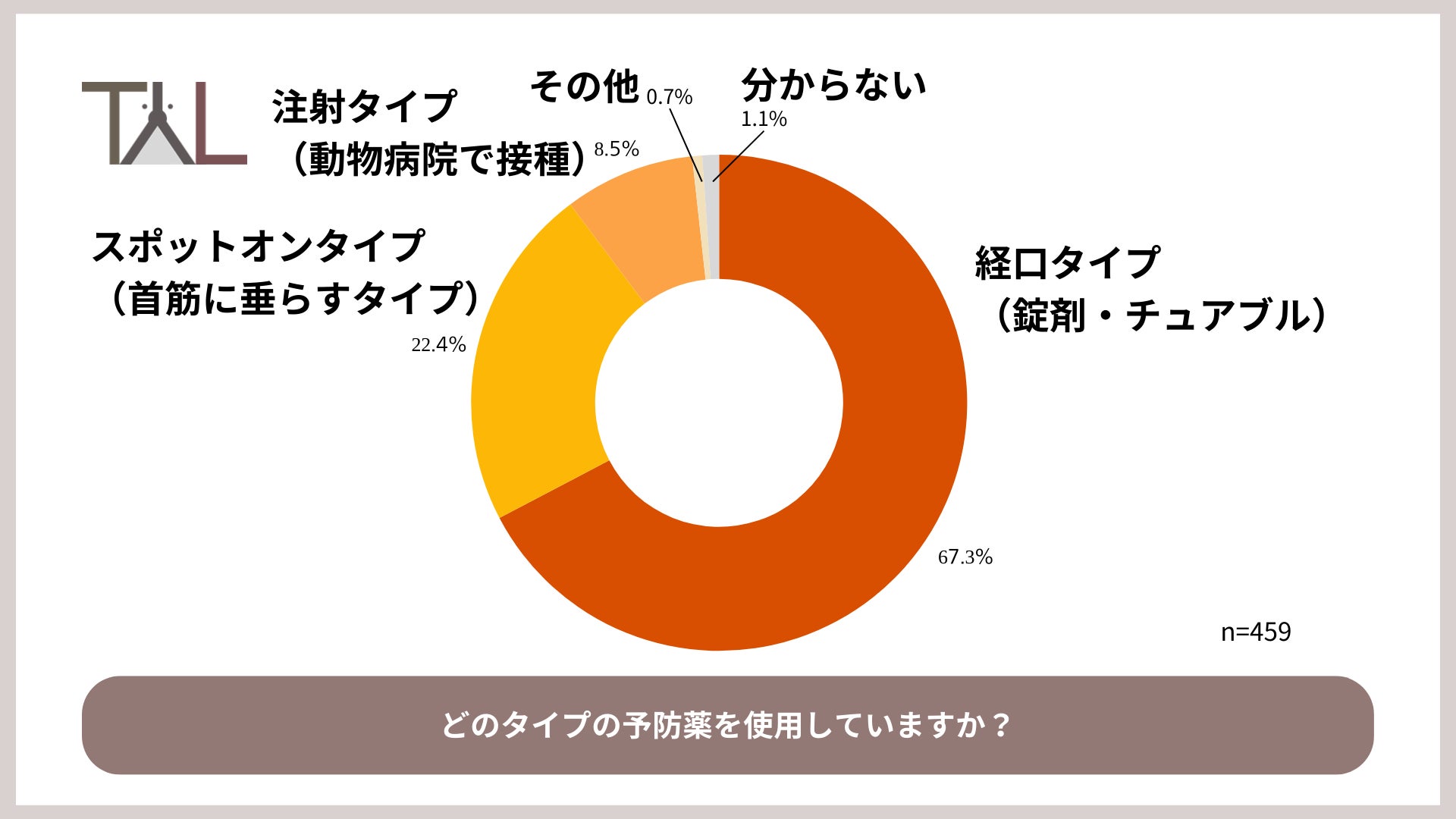 Q2で「予防薬を与えていない」または「分からない」と回答した飼い主をのぞく459名の飼い主に対して「 どのタイプの予防薬を使用していますか?」と質問したところ、「経口タイプ(錠剤・チュアブル)」と回答した方が過半数の67.3%、次に多かったのが「スポットオンタイプ(首筋に垂らすタイプ)」で22.4%、「注射タイプ」と回答した飼い主は8.5%でした。