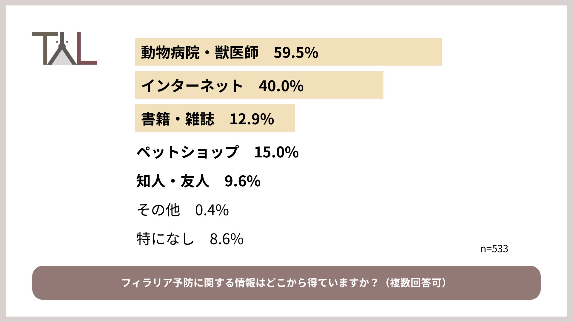 Q1でフィラリアについて「よく知っている」または「名前は聞いたことがある」と答えた犬の飼い主533名に対して「フィラリア予防に関する情報はどこから得ていますか?」と質問したところ、半数を超える59.5%の飼い主が「動物病院」と回答しました。次に多かったのが「インターネット」(40.0%)で、飼い主にとってWEBでの検索も重要な情報源となっていることがわかりました。そのほかに「ペットショップ」(15.0%)、「書籍・雑誌」(12.9%)、「知人・友人」(9.6%)といった回答も見られました。