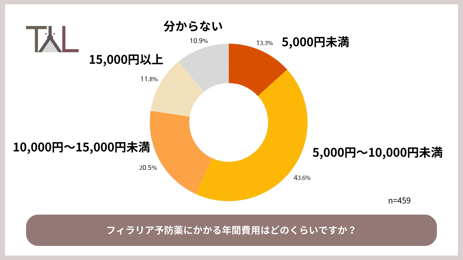 また、Q2で「予防薬を与えていない」または「分からない」と回答した飼い主をのぞく459名の飼い主に対して「フィラリア予防薬にかかる年間費用はどのくらいですか?」と質問したところ、最も多かったのは「5,000円~10,000円未満」(43.6%)、ついで「10,000円~15,000円未満」(20.5%)、「15,000円以上」(11.8%)という結果となりました。半数近くの飼い主が年間費用1万円未満でフィラリア予防をおこなっていることがわかりました。
