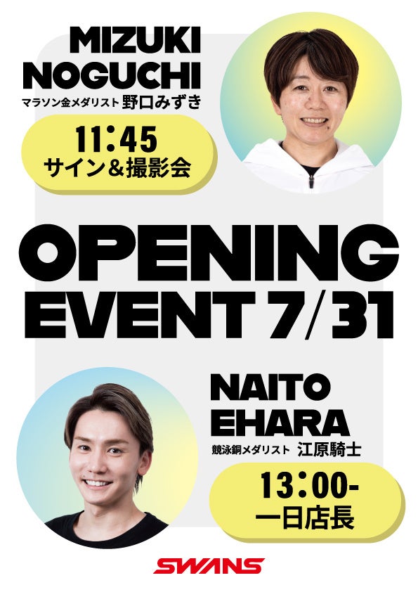 オープンを記念し、 7月31日(水)はマラソン金メダリスト 野口みずきさん、 競泳銅メダリスト江原騎士さんの2名が来店。五輪メダリストとお客様の交流を通じて、ココロオドル時間を提供いたします。また、期間中、ご購入金額が 5,000円以上(税込)のお客様にはもれなくSWANSオリジナル扇子のプレゼントも予定しています。