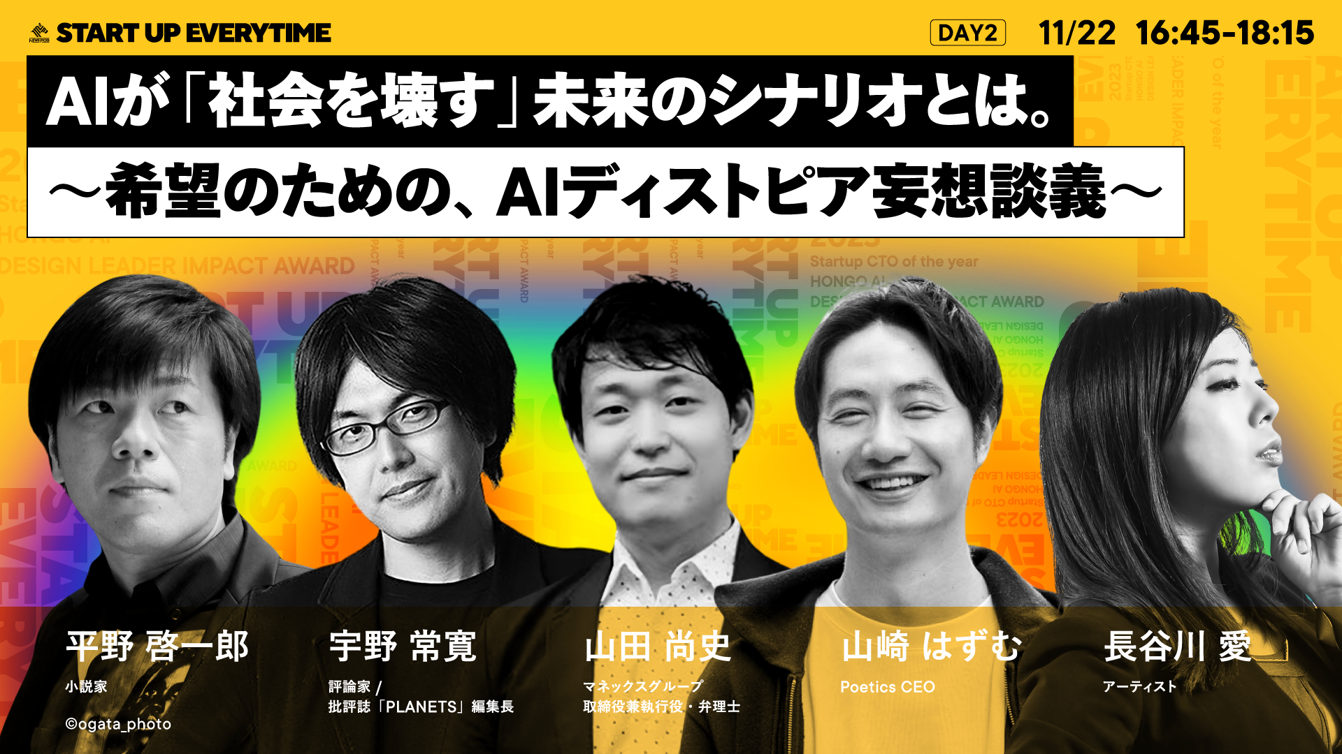 小説家の平野 啓一郎氏、評論家/ 批評誌「PLANETS」編集長の宇野 常寛氏、マネックスグループ取締役兼執行役・弁理士の山田 尚史氏、アーティストの長谷川 愛氏とともに当社代表取締役の山崎はずむが登壇します。今回のセッションでは、倫理的な観点を取り入れながら、AIと人間の共存を見つめなおすためのディスカッションの場を提供します。