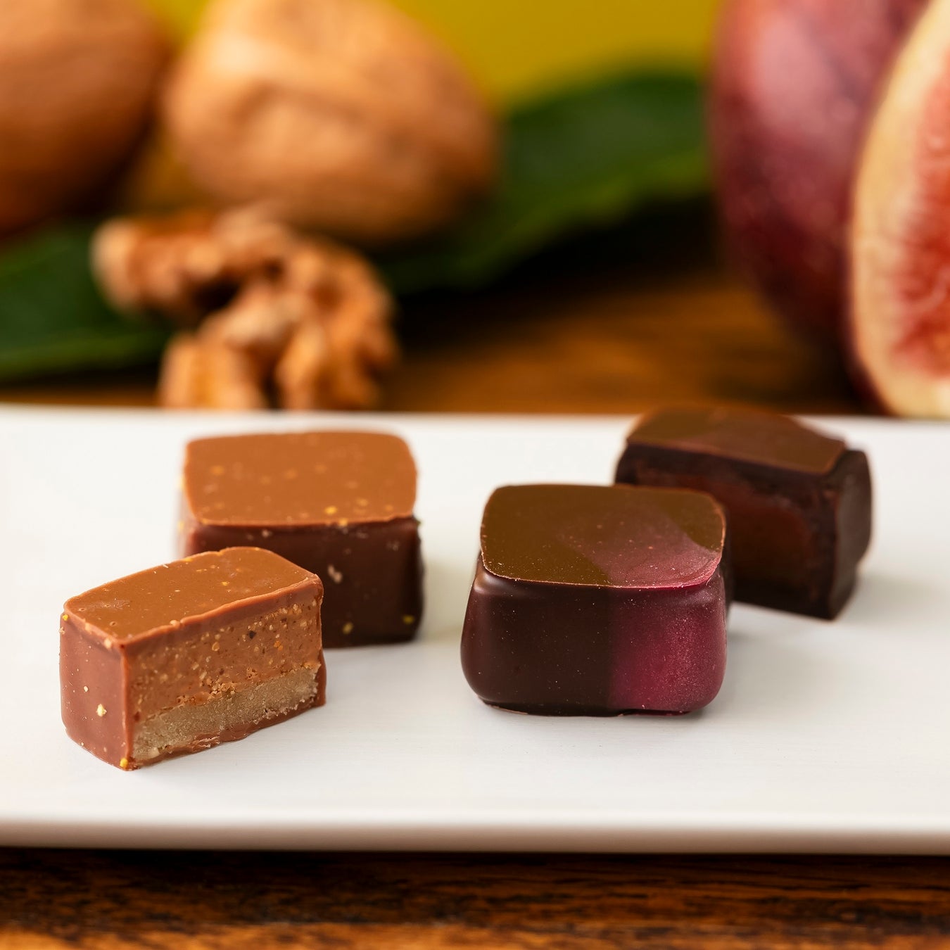 イチジクを加えたビターチョコレートとミルクチョコレートのガナッシュを、ビターチョコレートでコーティング。