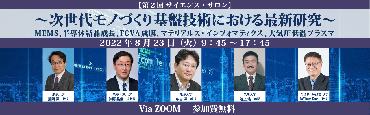 【第2回 サイエンス・サロン】次世代モノづくり基盤技術における最新研究~MEMS、半導体結晶成長、FCVA成膜、マテリアルズ・インフォマティクス、大気圧低温プラズマ~を2022年8月23日(火)に開催いたします。