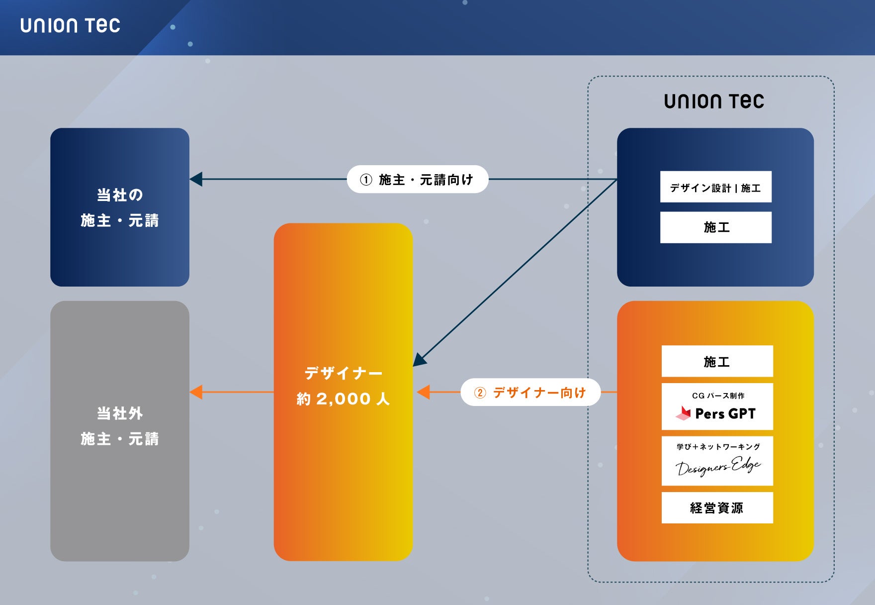 オフィスや商業施設を中心としたエンドユーザーへのデザイン提供に留まらず、業界全体の発展に貢献することを志向しております。そのため自社で成功した仕組みや技術の社外提供しています。取り組みを通して構築した多数の空間デザイナーとのネットワークを活用し、短期的には「受注率の向上や施工依頼の増加」を、長期的には「ユニオンテックのサービスを通じた業界全体の取扱高の向上」を目指します。