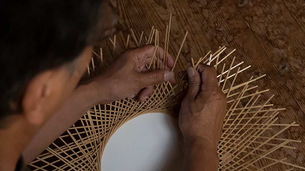 榎本氏は、0.1mm単位で何度も試作を重ね、繊細さを保ちつつも実用的に使える竹の幅や厚みを実現。竹は、柔らかさ、硬さ、曲げやすさも、一本一本に違いのある手間のかかる素材です。基本的な4種類くらいの道具を使って、作家の技術で加工して仕上げていきます。榎本氏曰く「工芸の中で一番原始的な仕事であり、単純な仕事だからこそ、作った人の技術が活きてくる。」といいます。