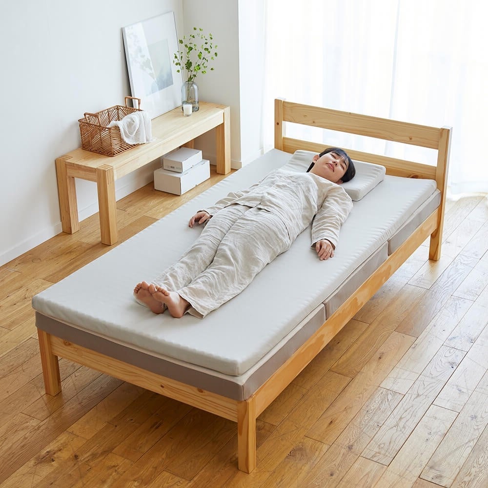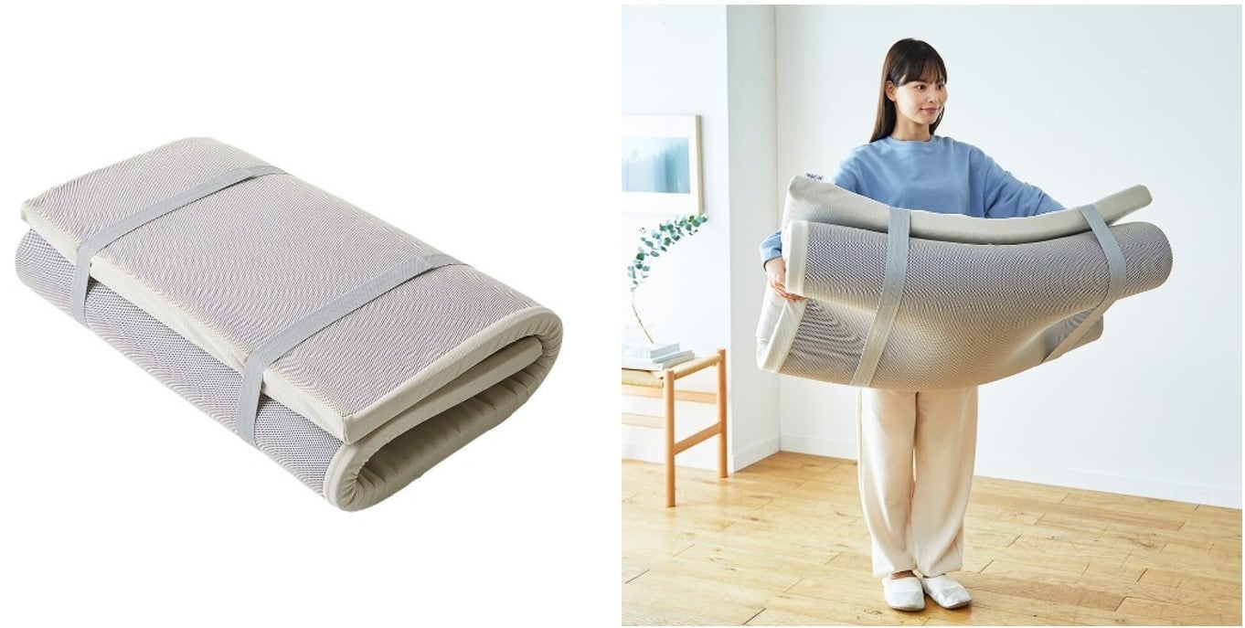 お手持ちのマットレスや敷きふとんの上に重ねることで、身体が沈み込み過ぎず体圧が分散されて理想的な寝姿勢がキープされます。3つ折りにすると持ち運びが楽にでき、ご自宅内での移動や収納・お車での持ち運びも可能です。