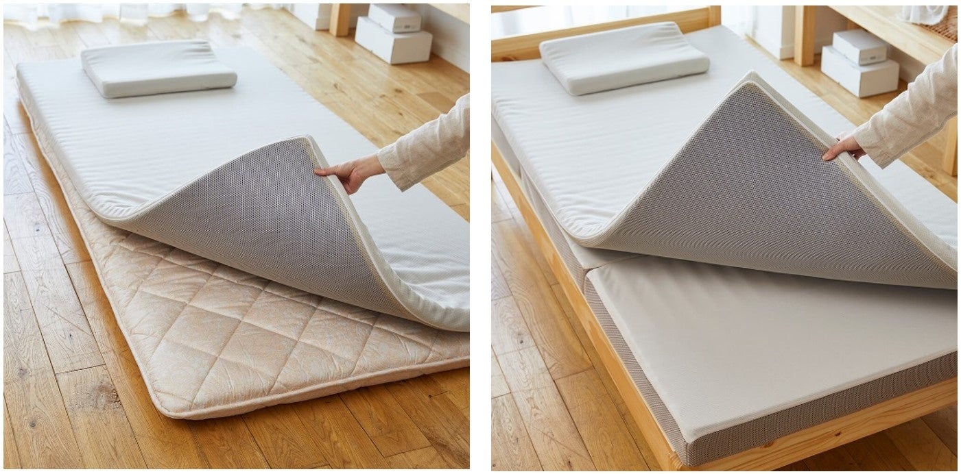 マットレスや敷きふとんの上に重ねて使用することで、身体の沈み込みによる負担が軽減され、体圧分散と理想的な寝姿勢がキープされます。