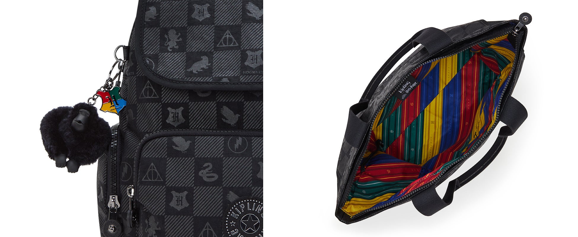 各商品にはキプリングモンキーと共にホグワーツのシンボルのエナメルチャームが付き、内側にはリサイクルポリエステルの裏地が各寮の鮮やかなカラーで彩られています。