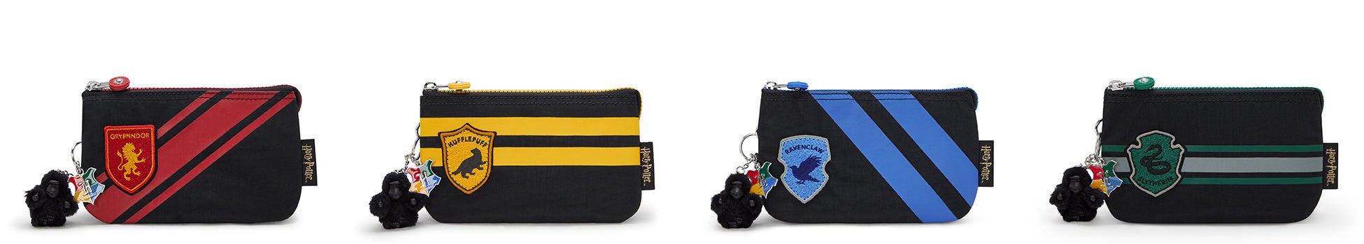キプリングのシグネチャーであるクリンクルナイロンに、4つの寮(グリフィンドール、レイブンクロー、スリザリン、ハッフルパフ)のエンブレムが、チェック模様にプリントされたデザインでハリー・ポッターのスタイルが表現されています。