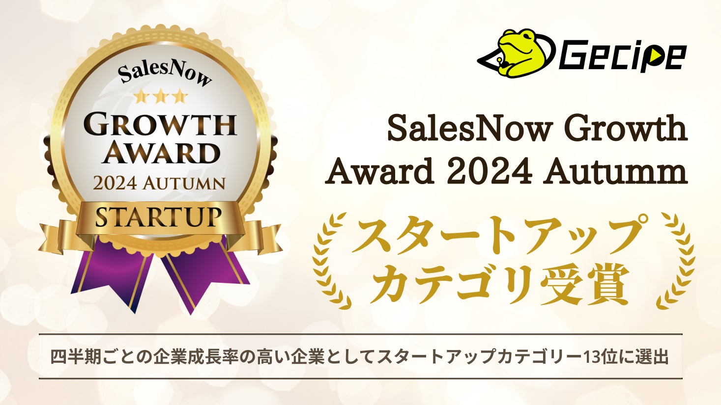 eスポーツを活用したメタバース教育スタートアップ企業のゲシピ株式会社(本社:東京都中央区、代表取締役:真鍋 拓也、以下「ゲシピ」)は株式会社SalesNowが国内540万社の動的データから急成長企業を選出する「SalesNow Growth Award 2024 Autumn」のSTARTUPカテゴリーに選出されたことをお知らせいたします。
