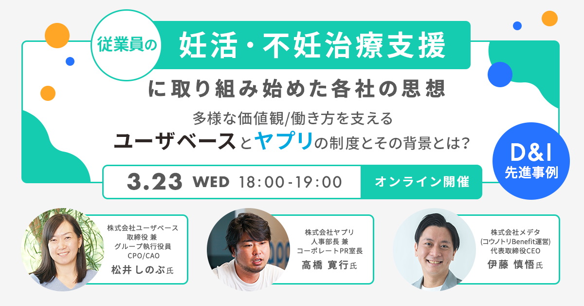 今回は、国内でもいち早く「妊活・不妊治療と仕事の両立支援」に取り組み始めたユーザベース社とヤプリ社の人事トップをお招きし、制度の背景にある思想・考え方から、実際に企画設計・運用する上でのポイントについて、実際の事例を基にお話していきます。