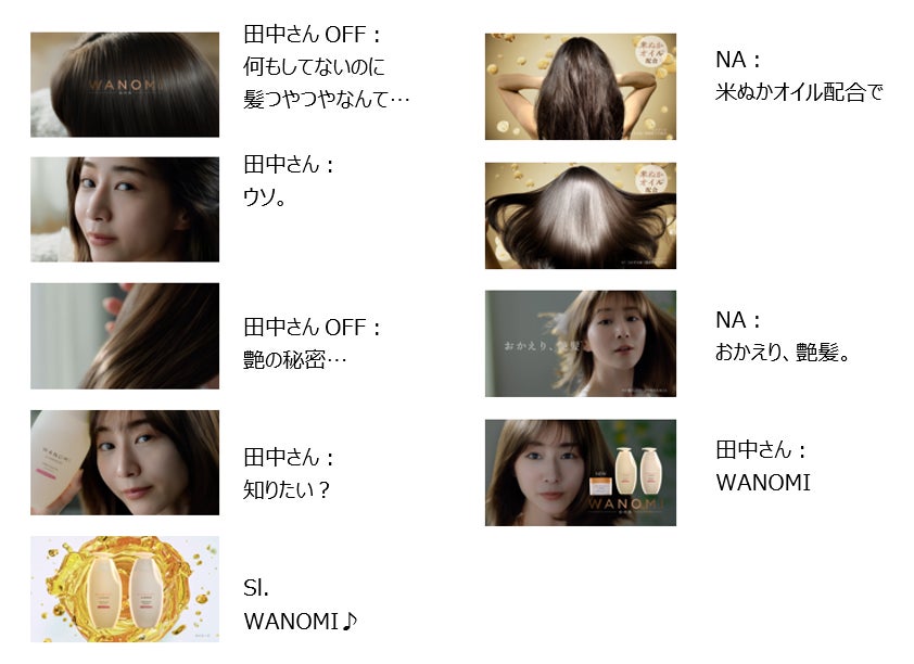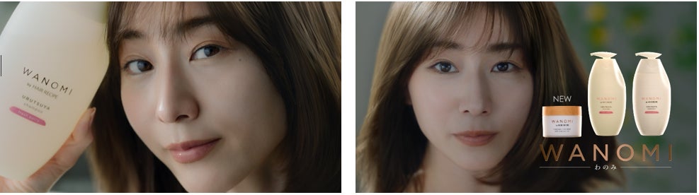 新CMでは「おかえり、艶髪。」というテーマの下、田中みな実さんの印象的な語りと、美しい髪、仕草、表情をクローズアップで捉えた映像を通じて、年齢やライフステージにより変化する女性の髪質を、根元から毛先までうるおいに満ちた艶髪へ導く「WANOMI(わのみ)」のメッセージを表現しました。昼下がりのリビングで、自身の艶やかな髪をかき上げながら登場する田中さん。美しい艶髪を保つ秘訣が「WANOMI(わのみ)」であることをまだ知らない人たちに向けて、「ウソ」「知りたい?」とドキッとするような表情で問いかける姿にご注目ください。