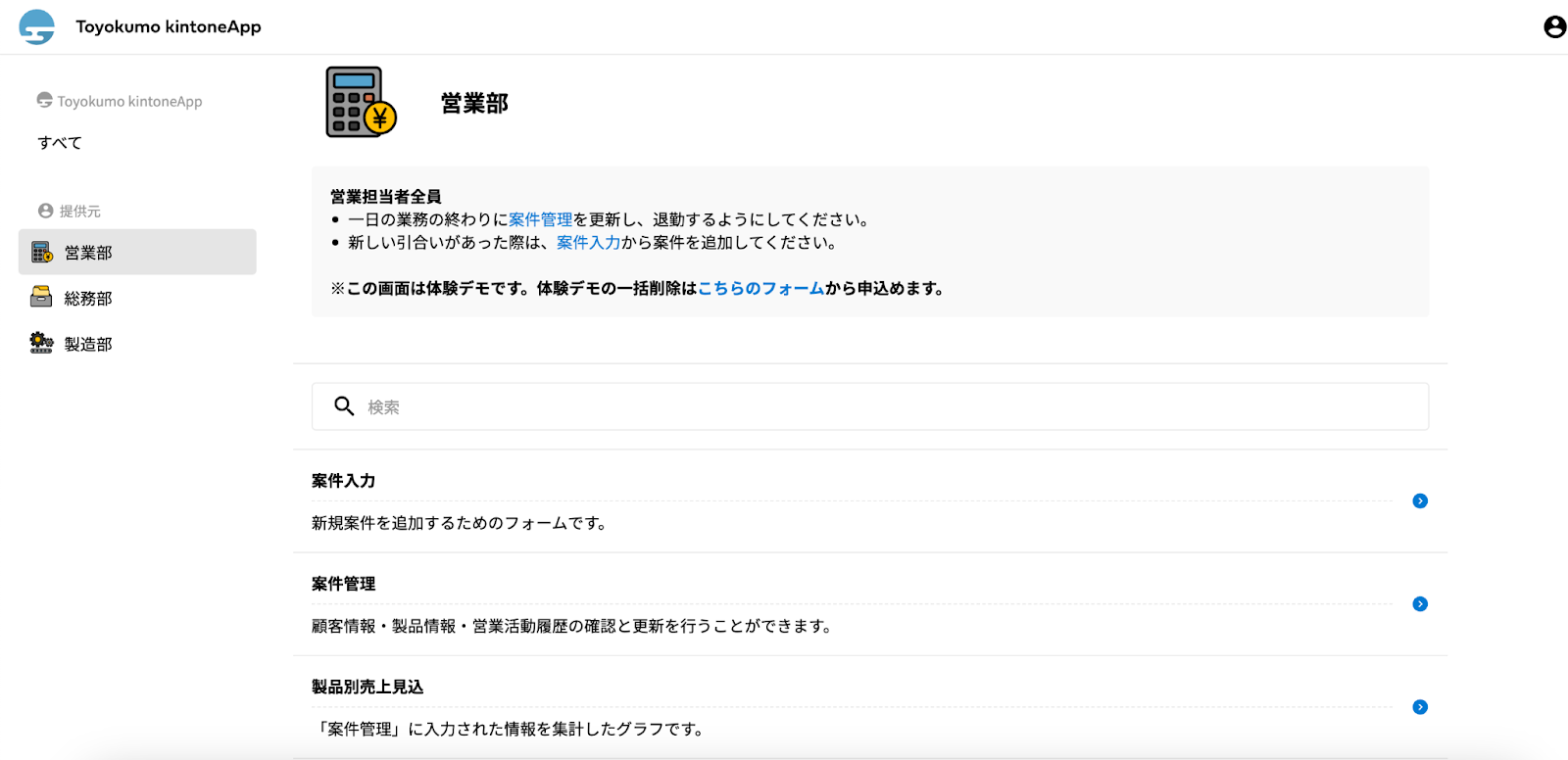ログインすると、「営業部」「総務部」「製造部」から提供されているフォームやビューが表示されます。