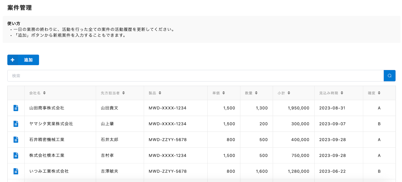 「案件管理」をクリックすると、kViewerで作成した「案件管理」ビューが確認できます。このように、kintoneで管理している「案件情報」をアクセスを許可しているユーザーへ公開が可能です。