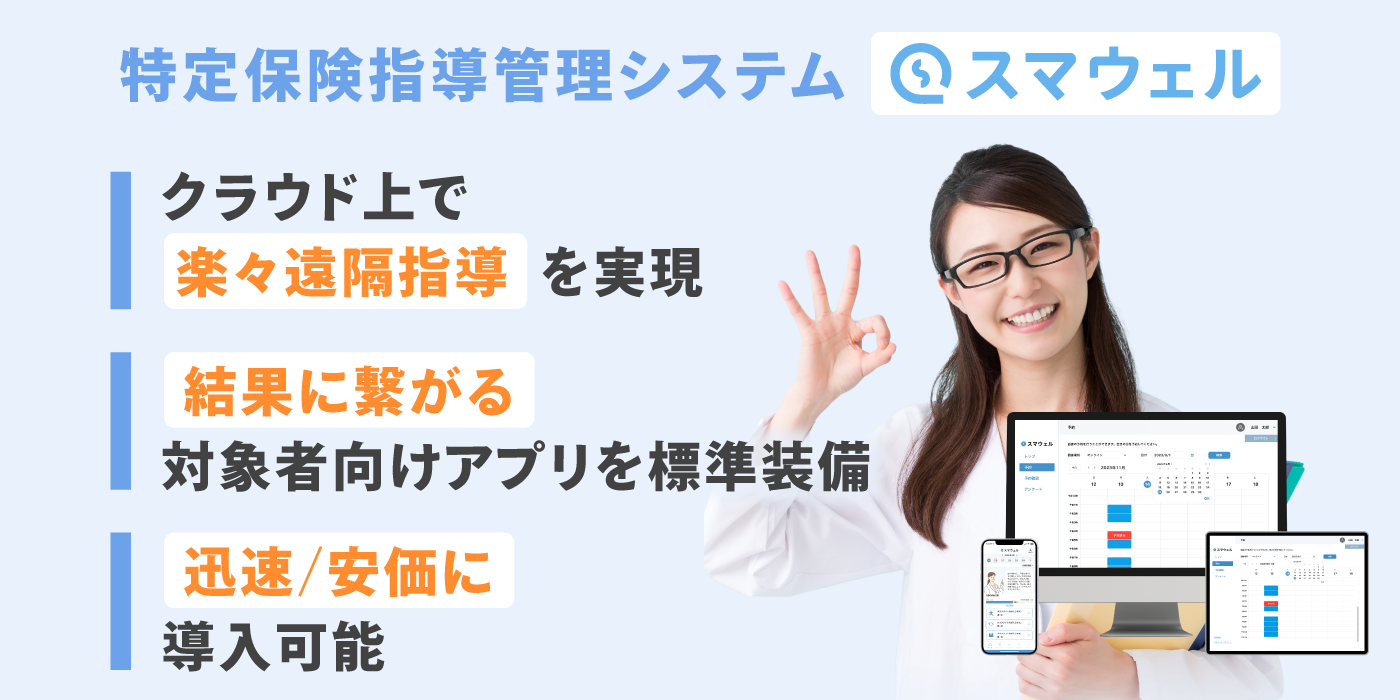 「スマウェル」は、煩雑になりがちな特定保健指導業務を一元管理できるクラウド型システムです。