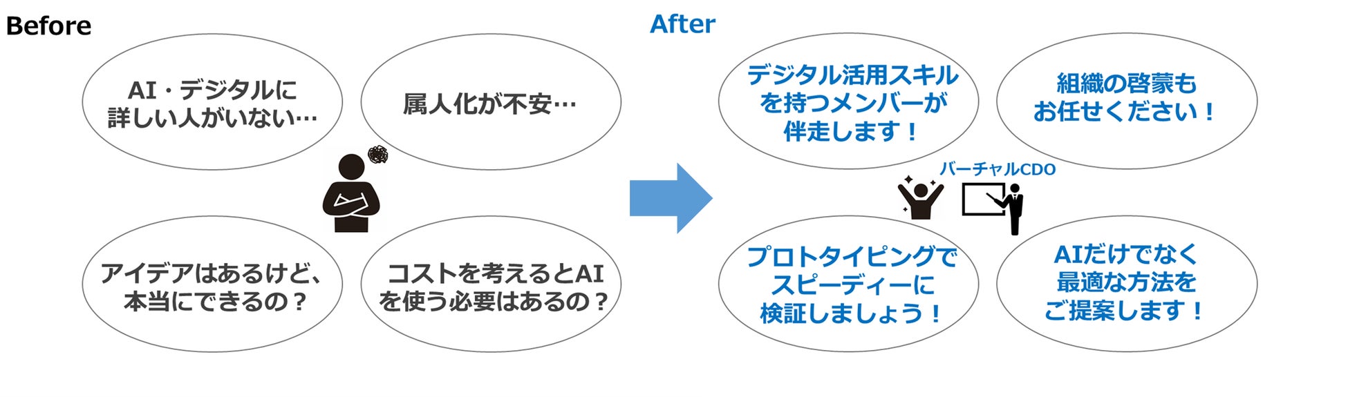 サービス内容:当社のAI実装支援部門がお客さまと一緒に仮想的なデジタル推進チームとして活動し、社内のデジタル変革を継続的にサポートします