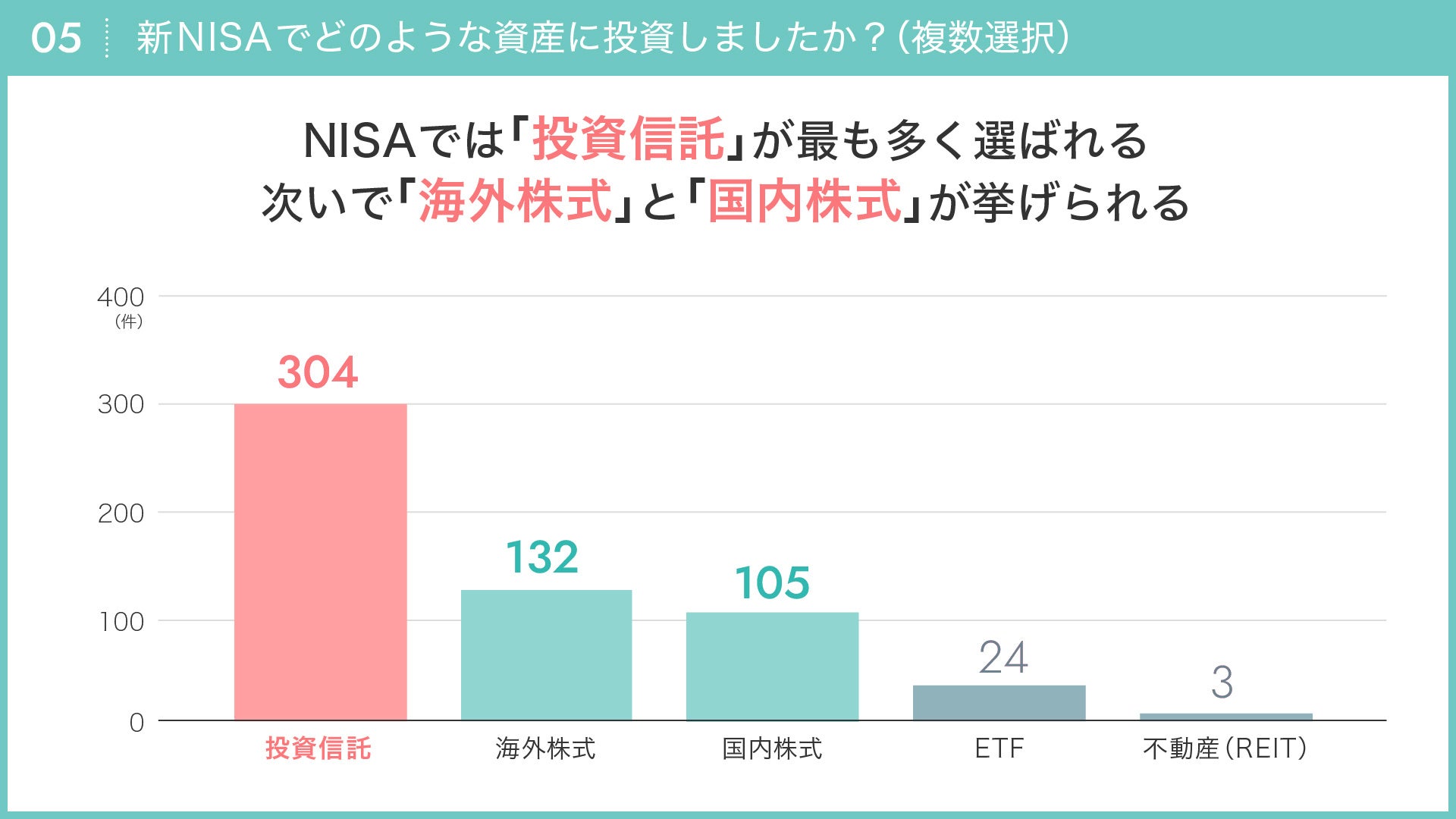 「新NISAでどのような資産に投資しましたか?」という質問に対して、最も多かったのは「投資信託」で、全体の中で主流となっていることがわかりました。NISA制度が初心者から経験者まで幅広い層に対応する設計となっており、分散投資がしやすい投資信託が適していることが考えられます。