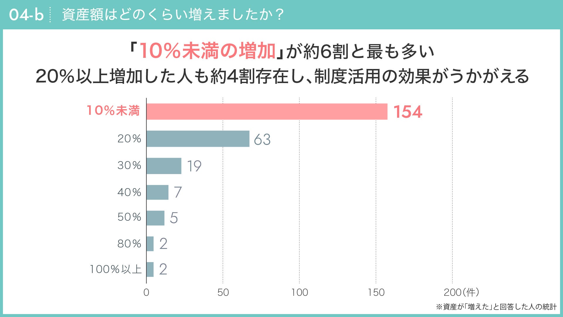 さらに、資産が増加したと回答した人の多くが「10%未満の増加」と回答しており、着実に資産形成が進んでいる様子がうかがえます。