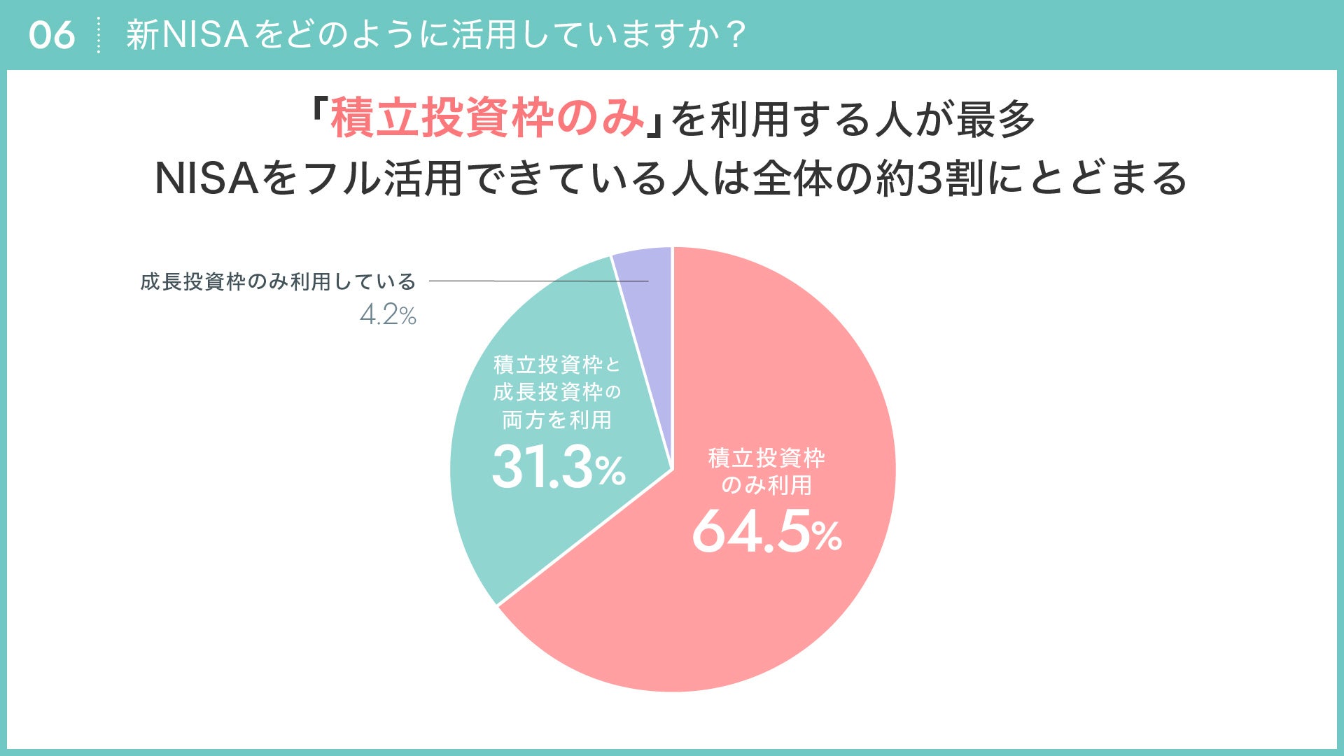 一方で、新NISAの制度をフル活用している人は全体の約3割にとどまる結果となり、成長投資枠の利用が進んでいない実態も浮き彫りになりました。