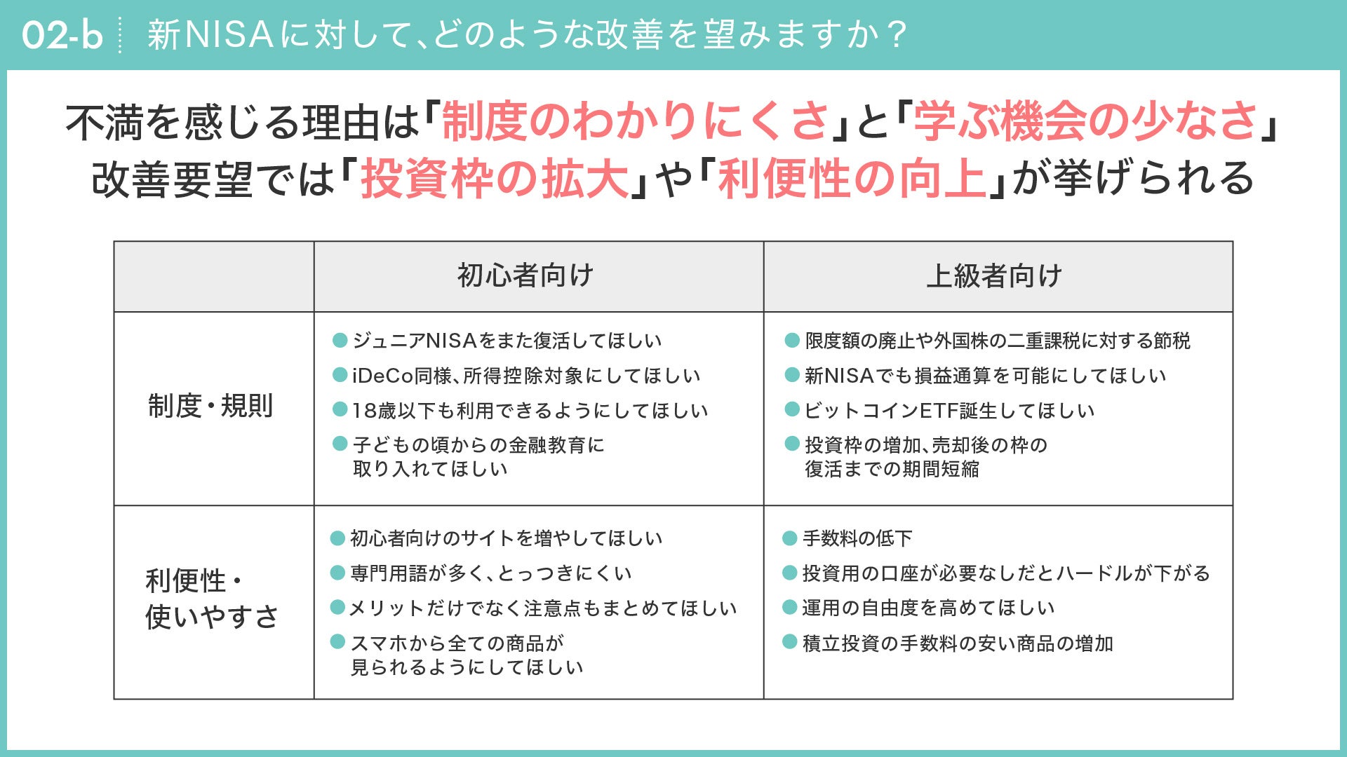 さらに、スマートフォン対応の強化や口座開設の簡素化など、利便性向上を望む声も多数。新NISAのさらなる普及と信頼性向上のため、積極的な広報活動を求める意見も目立ちました。