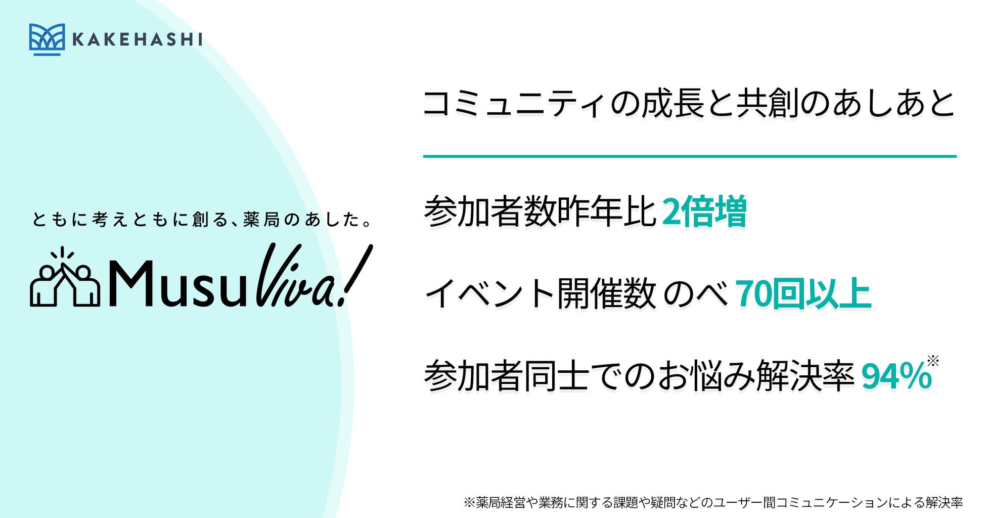 株式会社カケハシ(本社:東京都中央区、代表取締役社長:中尾 豊、代表取締役CEO: 中川 貴史、以下、当社)が運営する、Musubiユーザー薬局・薬剤師コミュニティ「MusuViva!(ムスビバ)」(以下、MusuViva!)が、開設2周年を迎えました。