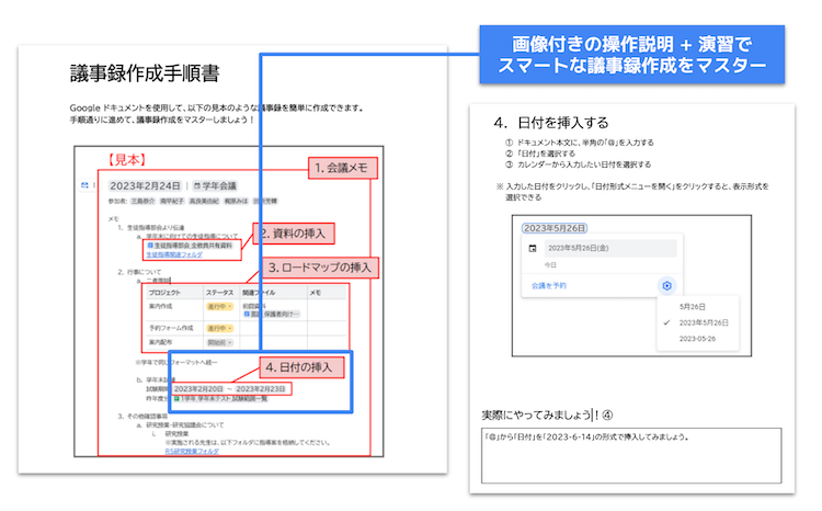 テンプレートでは、日付やファイルを簡単に挿入できる「スマートチップ」機能の使い方を、画像付きの丁寧な操作説明と演習でバッチリマスターすることができます!会議の参加メンバーで共有し、すっきりと整理された議事録を簡単に作成しましょう!