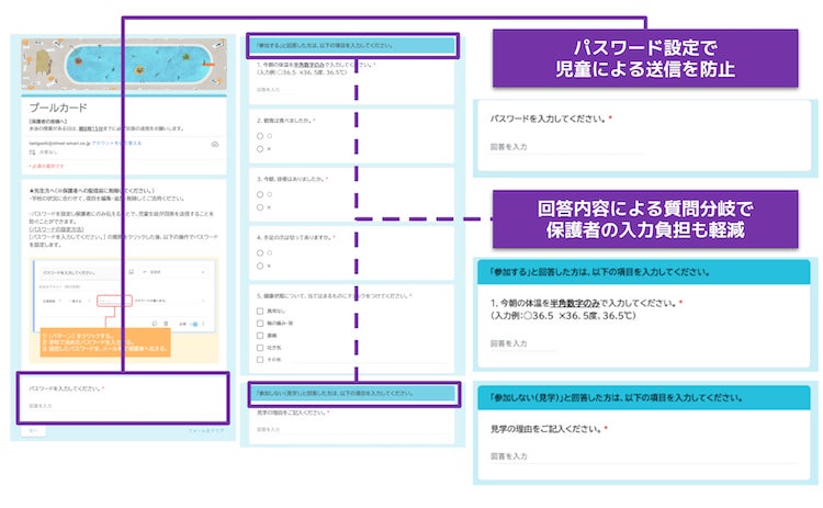 何かとバタバタする水泳授業の朝。プールカードをデジタル化することで、配布→回収→確認→返却を効率化できます!回答は Google スプレッドシート™ に書き出しておけるので、子どもたちの回答状況がリアルタイムに記録され、一元管理が可能です。子どもたちの登校前に職員室で回答内容を確認すれば、登校後の時間に余裕が生まれます。任意のパスワードを設定することで、パスワードを保護者に周知して、児童からの誤送信を防ぐことも可能です。