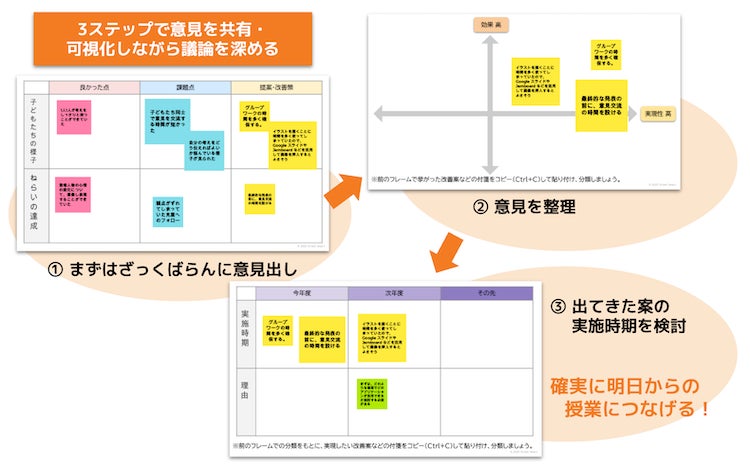 意見整理のための枠を多数ご用意しており、項目は編集することができます。先生方全員で共有して、付箋を動かしたり色を変えたりしながら意見を可視化し、明日の授業につながる議論を深めましょう!データが残るので、いつでも協議内容を振り返ることができるのも嬉しいポイントです。