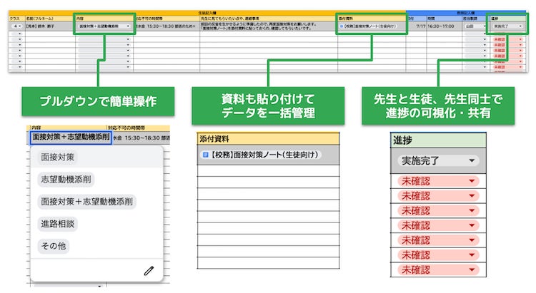 生徒それぞれに丁寧な対応が必要となる面接対策。個人単位での予定調整や資料のやり取りは管理が煩雑になりがちですよね。先生同士だけではなく、生徒とも予約シートを共有することで日程調整をスムーズに行えます。1枚のシートで「予約・調整・資料共有」が完結!さらに、進捗状況も共有できるので、漏れ無く実施できます。