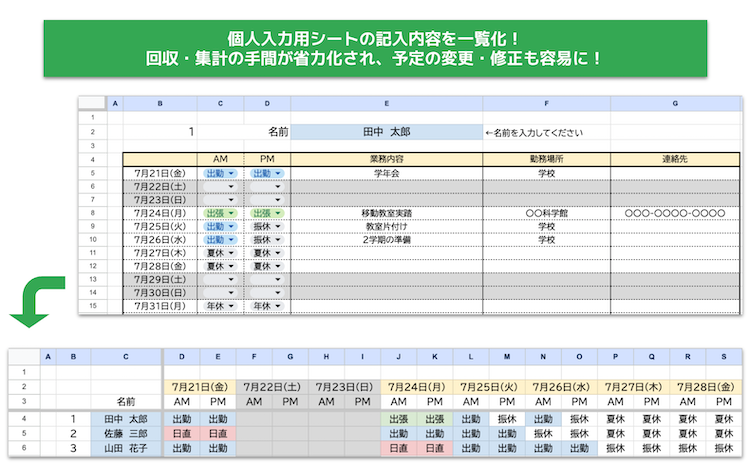 個人の予定を入力すると、一覧のシートに自動反映!一覧のシートでは、予定ごとに異なる色で表示されるので、該当日の全教職員の予定を一目で確認することができます。