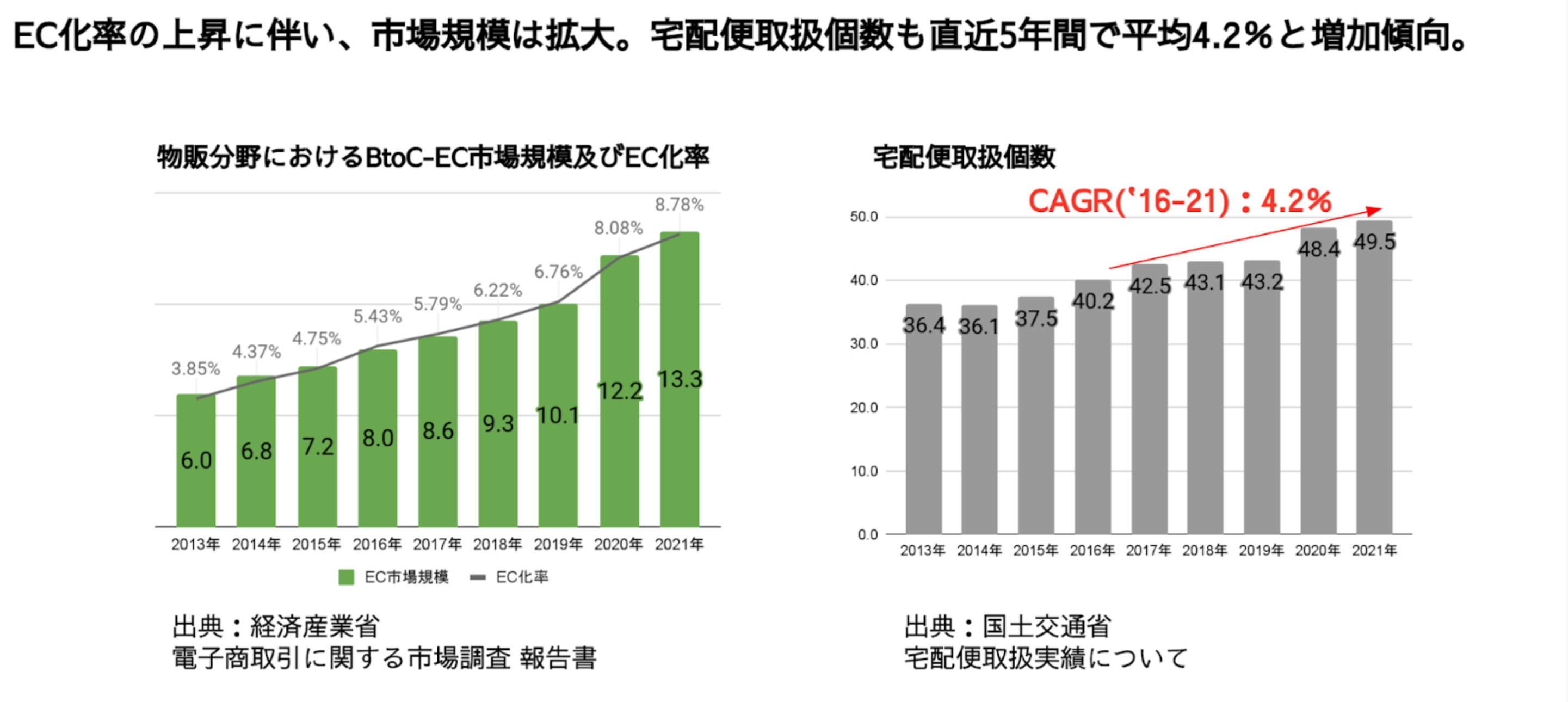 物販分野におけるEC市場は年々増加傾向にあります。それに比例し宅配便取扱個数も増加、さらに配達方法や物販の種類の多様化が進んでいます。