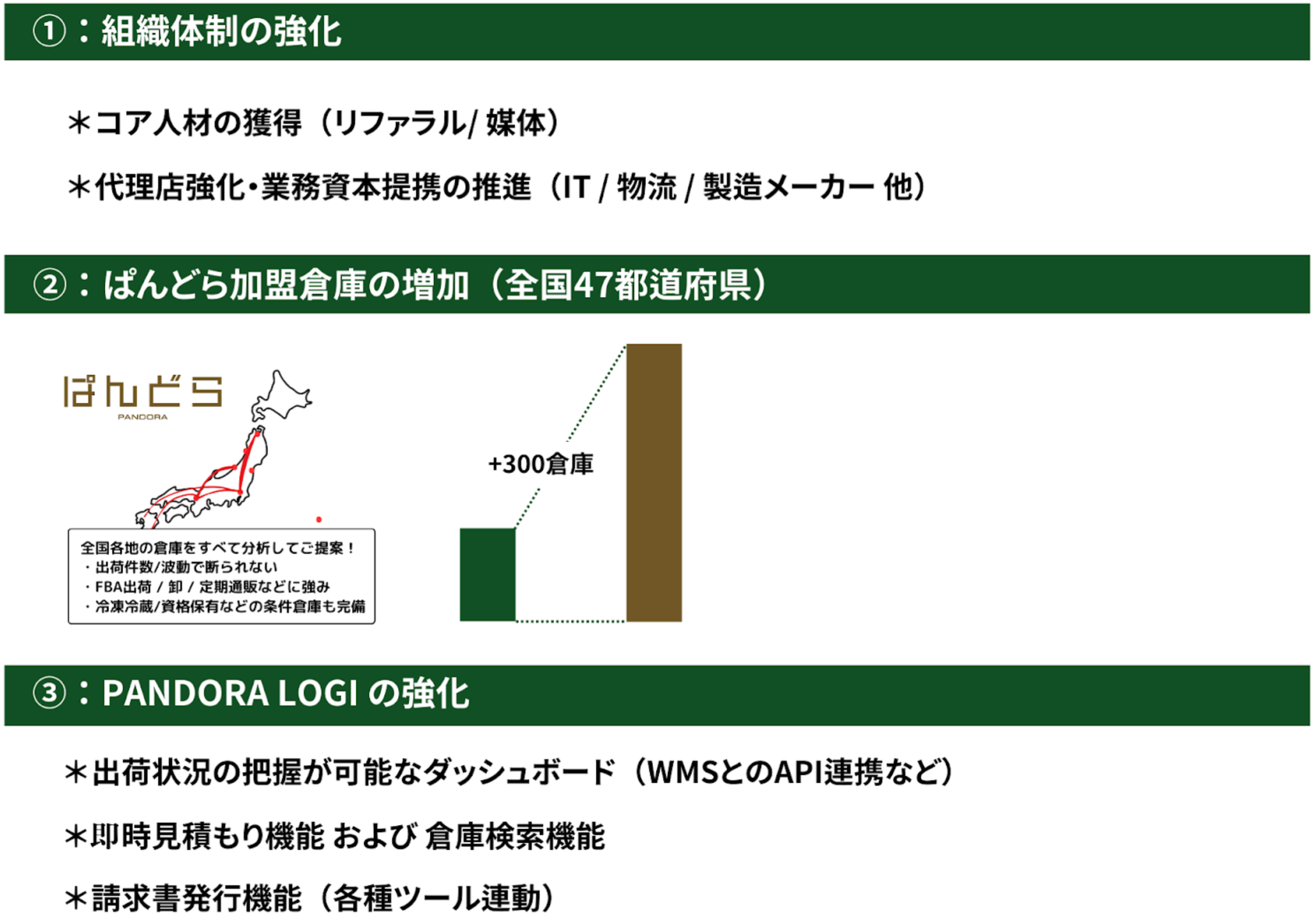 3:「PANDORA LOGI」の機能拡充:EC事業者と物流倉庫が利用する「PANDORA LOGI」機能開発に充当します。情報を入力するだけで全国の物流倉庫から即時自動見積もりが表示される機能の実装や、物流倉庫の請求書発行業務を効率化するためのAPIによる自動計測システムなどを追加していく予定です。