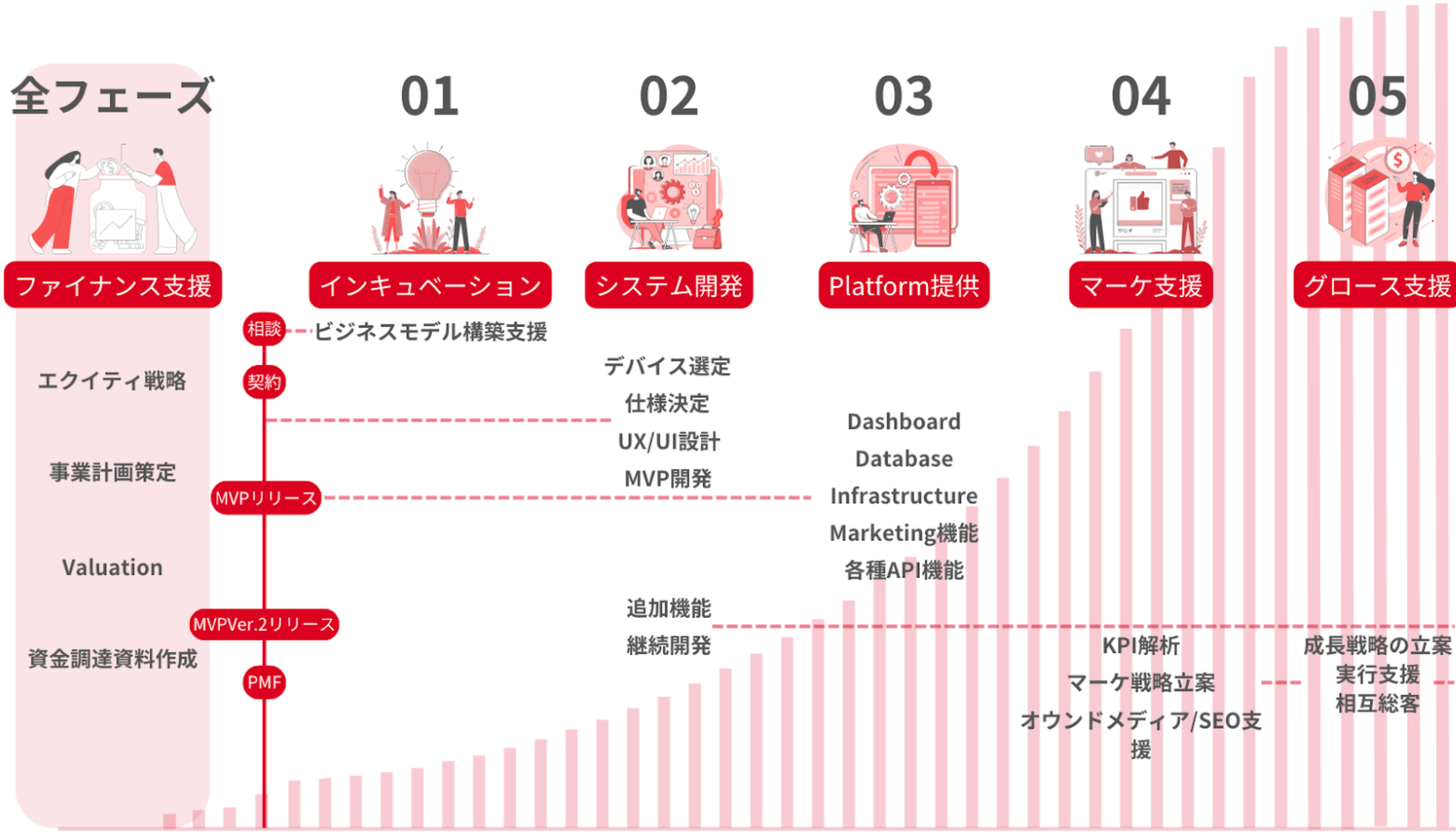 C2C社は、ぱんどら社のビジネスインキュベーション支援からシステム機能開発、マーケティング/グロース支援までを一気通貫で伴走しております。