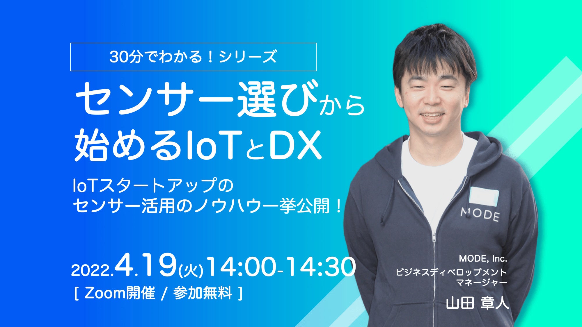 本セミナーではIoT導入の第一歩であるセンサー選定に注目し、IoTスタートアップのMODEがこれまで培ったセンサー選びと活用のポイント・ノウハウをご紹介します。MODEが自信を持ってオススメするセンサーパートナーと共に実際の活用事例もあわせてご紹介します。