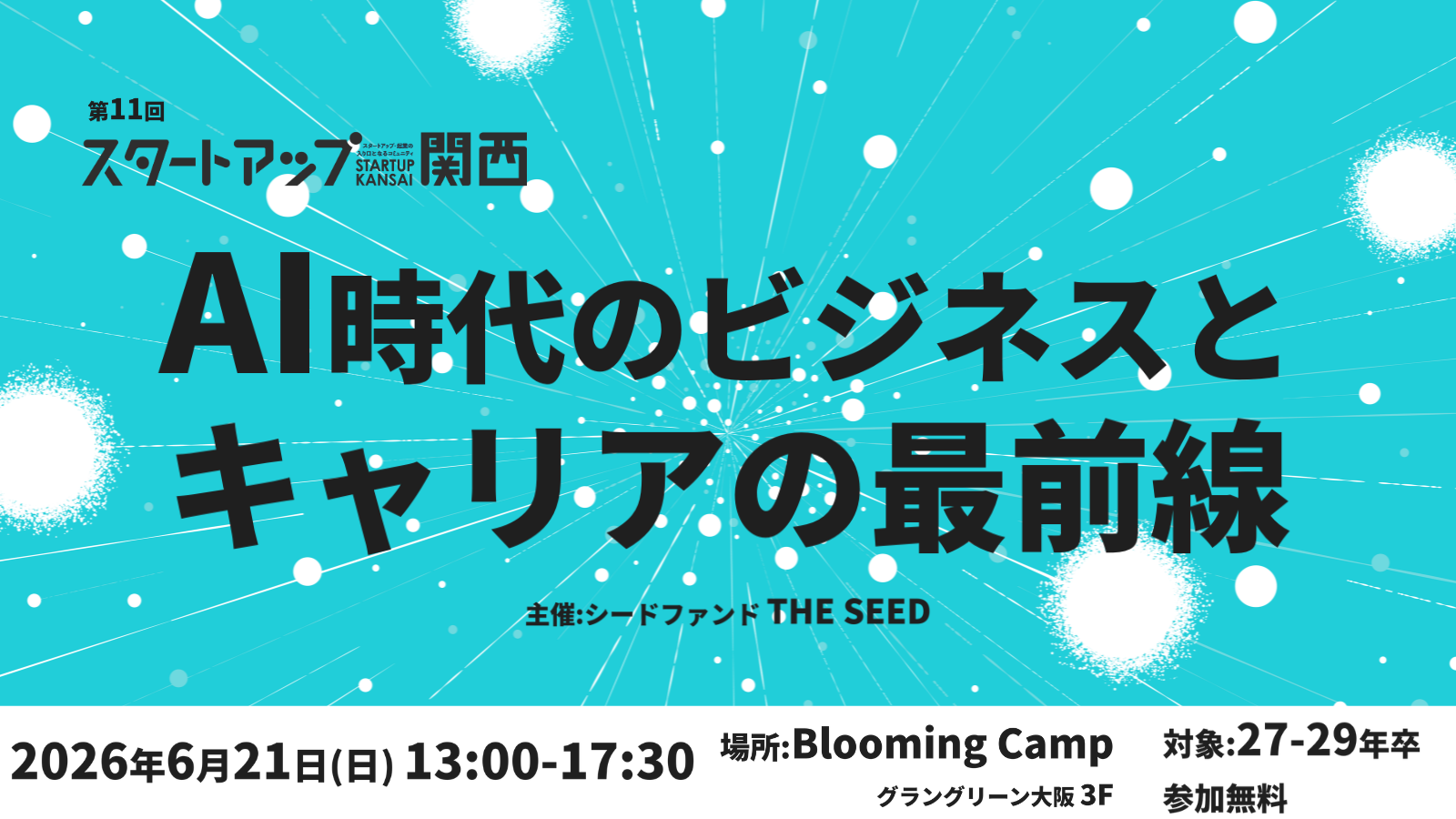 プレシード・シードVC「THE SEED」(本社:東京都渋谷区、代表:廣澤 太紀)は、関西の学生・若手社会人を対象としたスタートアップイベント「スタートアップ関西」の第11回を、2026年6月21日(日)にグラングリーン大阪 JAM BASE 3F「Blooming Camp」にて開催します。