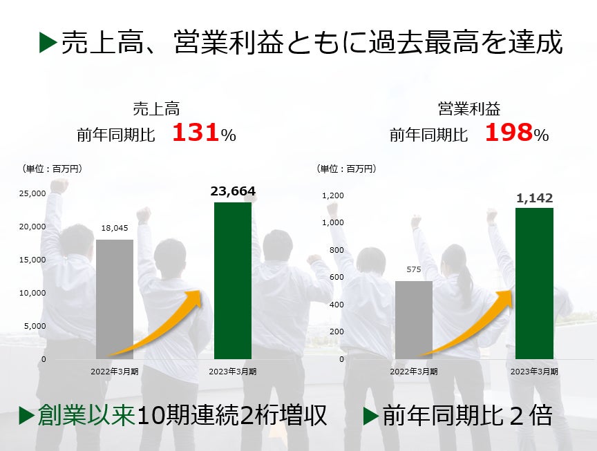 売上高は創業以来10期連続の2桁増収を達成、営業利益は前年同期比約2倍となります。