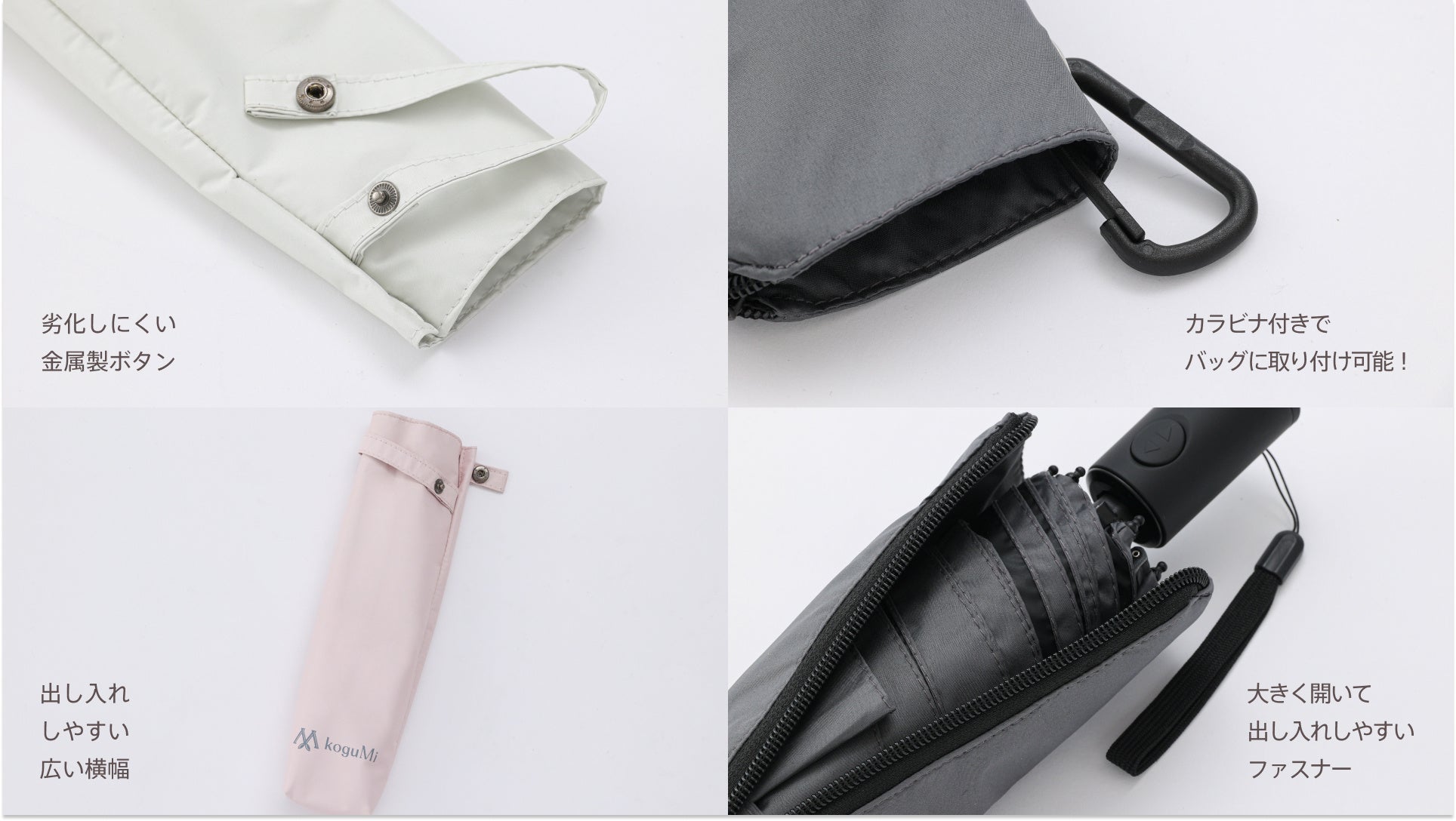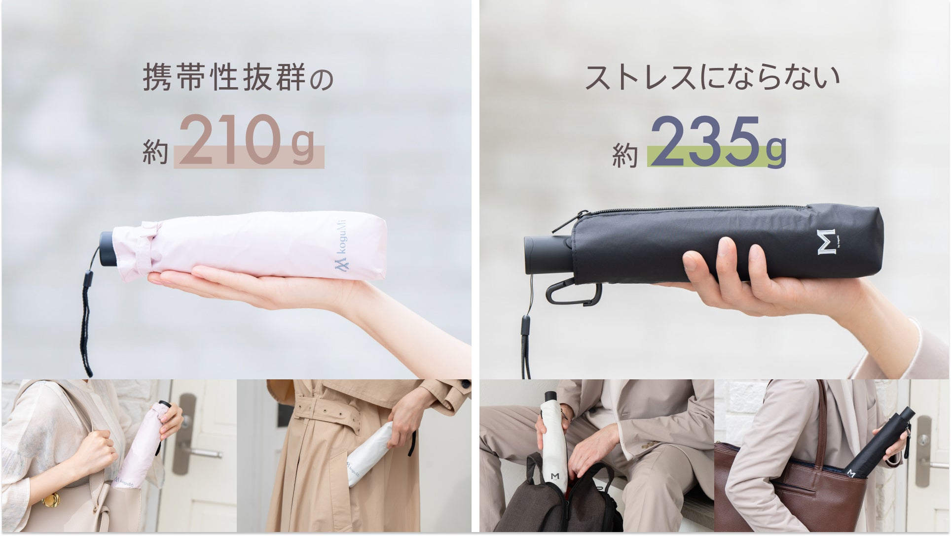 50cmサイズは210g、55cmサイズは235gと、自動開閉でありながら超軽量を実現しました。さらに、スリムな形状でバッグにもポケットにもすっぽり収まります。 いざという時のお守り傘として、常備しておくのもおすすめです。