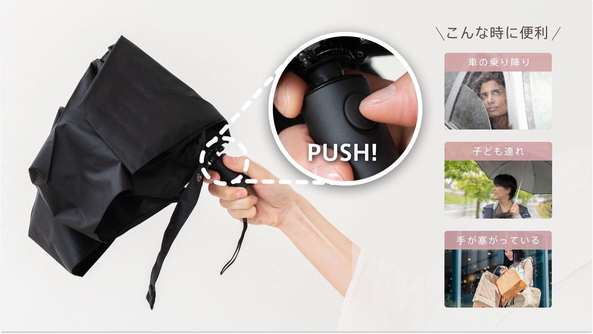 サッとひらくから「SARK(サーク)」です。ストレスなくスピーディに開閉いただける、ワンタッチの自動開閉式タイプを採用。荷物を持っている時や車の乗り降り、お子さんと手を繋いでいる時など、片手が塞がってる時もラクラク開閉できるのでとっても便利です。