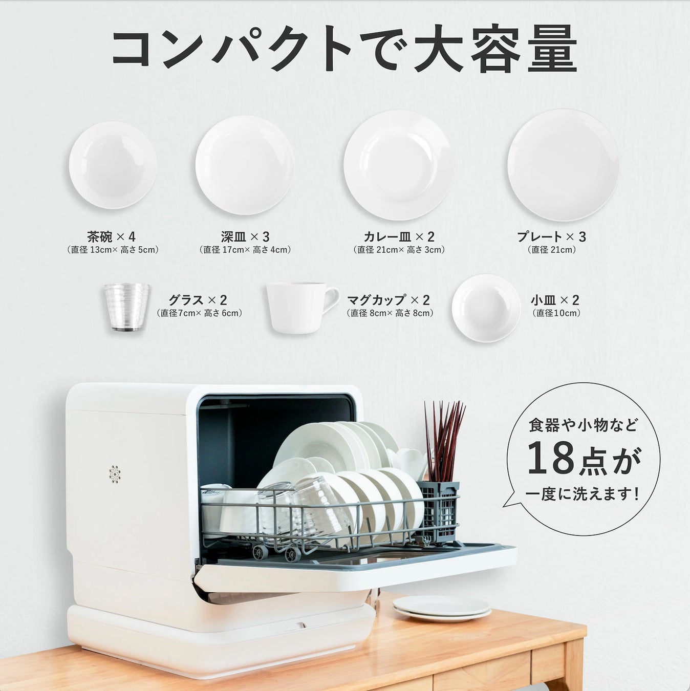 商品設置が非常に簡単で、届いた日から利用できます。キッチンのスペースに余裕がない場合でも非常に便利です。 水道用給水ホースも同梱されており、分岐水栓にも対応可能です。18点(2-3人分)の食器または最大直径30cmの食器を一度に洗える大容量を持っています。これにより、一人暮らしから3人の家族の方まで、様々なニーズに対応できます。また、6つの異なる洗浄コースによって食器を全方位から効率的に洗浄します。熱風乾燥機能も搭載しており、食器の洗浄後に、食器を濡れたままにせず、臭いやカビを除去し、結露を防ぐことができます。