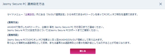 この連携により、「Jasmy Secure PC」をご利用中の企業は「AKASHI」側での出退勤打刻が不要となり、従業員の打刻漏れ防止・サービス残業の抑制に寄与し、勤怠管理関連業務の時間短縮につなげることができます。