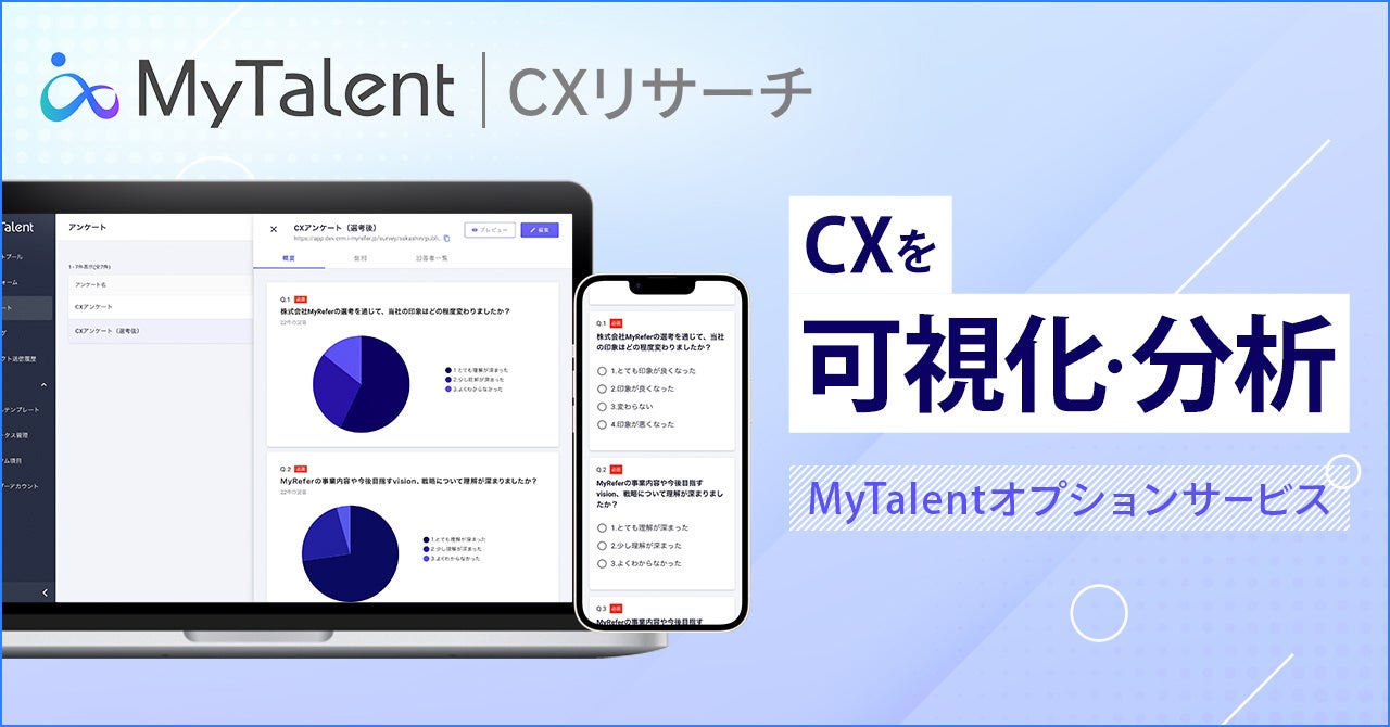 株式会社MyRefer(本社:東京都新宿区、代表取締役社長CEO:鈴木貴史)は、候補者のタレントプール構築・アプローチ・持続可能な仕組み化までを一気通貫で実現するタレントアクイジションSaaS「MyTalent」にて、応募・選考時の候補者体験(CX)を簡単に収集・分析するリサーチ機能「MyTalent CXリサーチ」を2022年10月20日より提供開始します。これにより、過去応募者のタレントプールの蓄積・活用を促進し、企業の自社採用力の向上に貢献します。(サービス資料URL:https://bit.ly/3eHXij2)