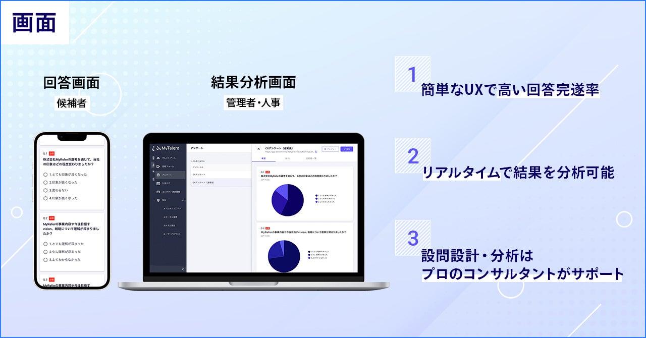 1.採用候補者にとって負担のない簡単なアンケートにより回答率が高く、人事側ではリアルタイムに効果を分析できます。