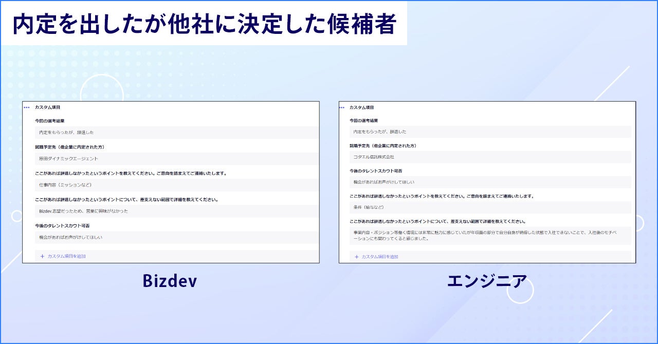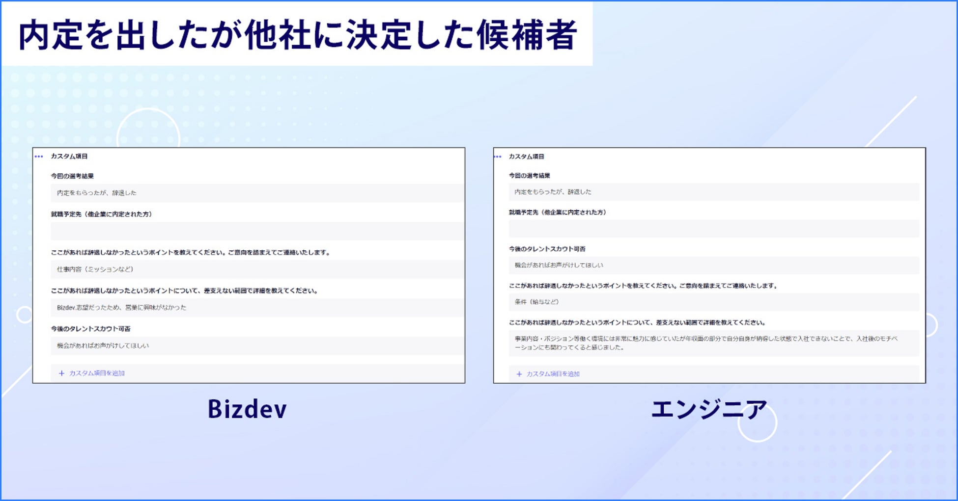 2.最終面接やオファー後の辞退理由・就職予定企業名を収集することで、採用戦略のブラッシュアップや中長期的な再スカウトの効果的な運用が実現します。