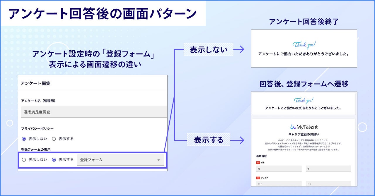 3.CXアンケート回答後にキャリア登録フォームで登録してもらい、スムーズに自社のタレントプールを構築できます。