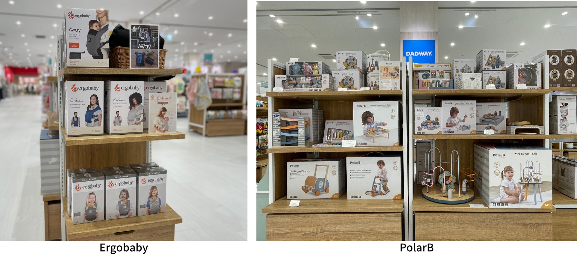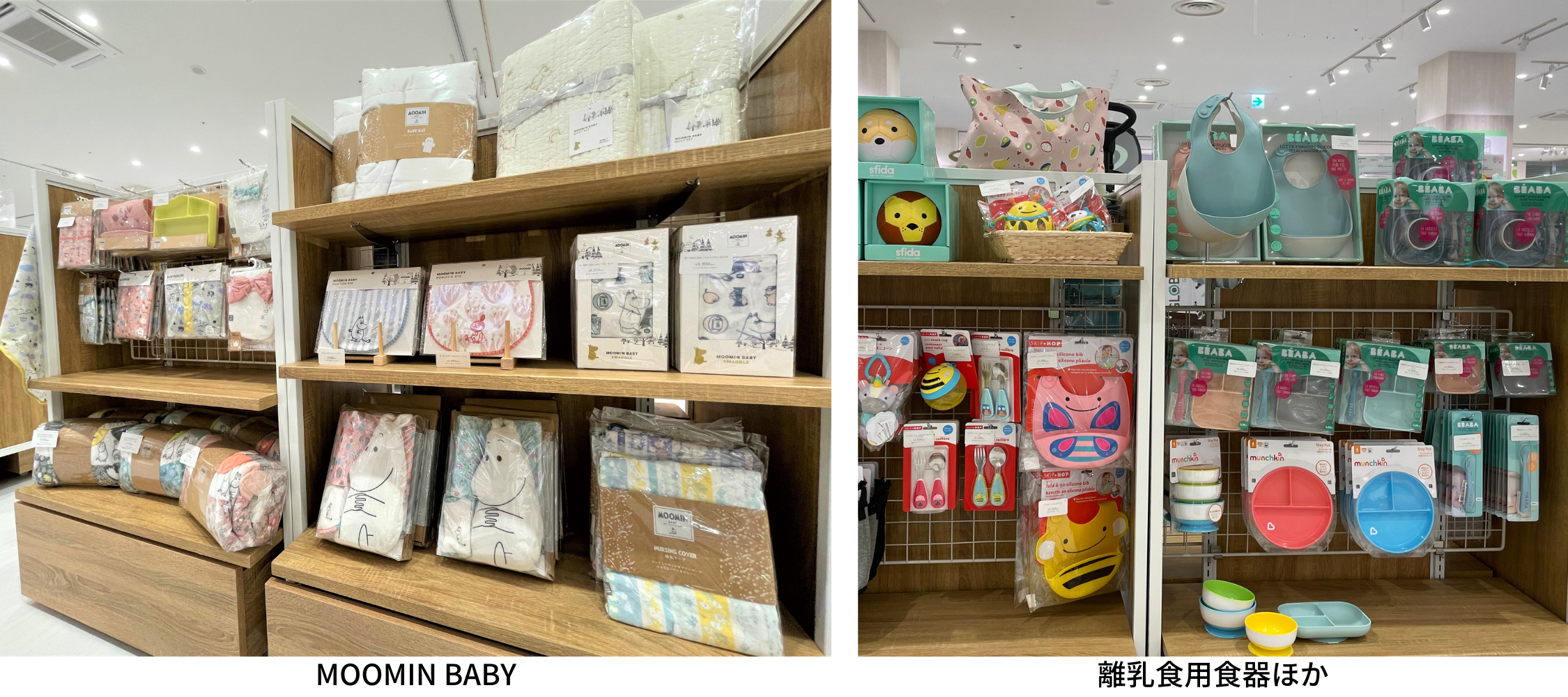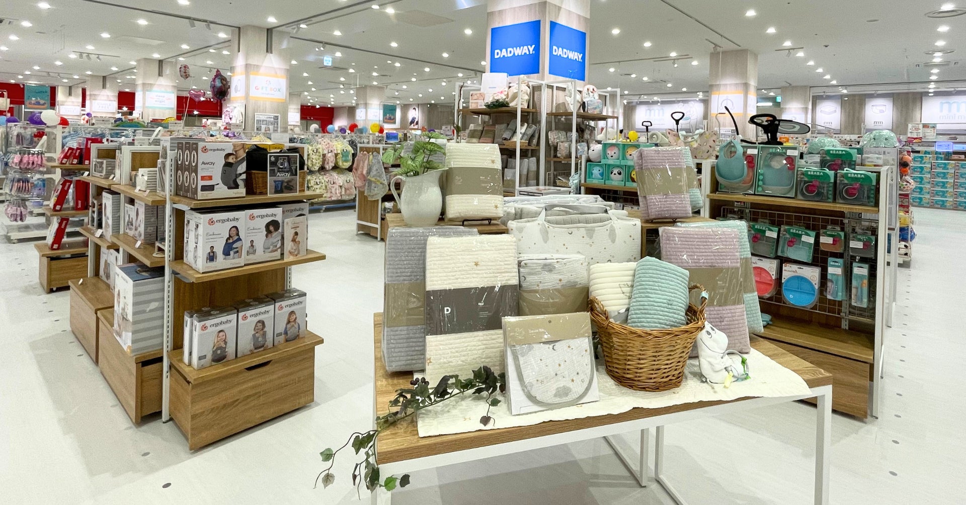 世界中の育児用品を紹介する DADWAYから生まれた「D by DADWAY(ディーバイダッドウェイ)」やフィンランド生まれのキャラクター「MOOMIN」のベビーブランド「MOOMIN BABY(ムーミンベビー)」など、日本の子育て事情やトレンドに配慮した自社開発商品を中心にラインナップ。