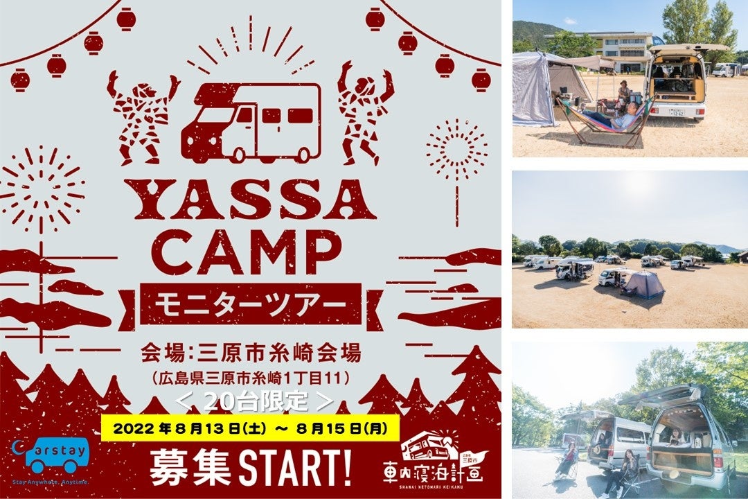 国内最大級のキャンピングカーレンタル・カーシェアと車中泊スポットの予約プラットフォーム事業を展開するCarstay(カーステイ)株式会社(本社:神奈川県横浜市、代表取締役:宮下晃樹)と株式会社KOTOYA(本社:広島県三原市、代表取締役:泉 太貴)などで構成する三原市車内寝泊計画実行委員会(みはらししゃないねとまりじっこういいんかい)は、「三原やっさ祭り」開催に合わせた、2022年第一弾のイベント「YASSA CAMP(ヤッサ キャンプ)モニターツアー※1」を開催、限定20台のキャンピングカー含む車中泊仕様の車で旅する参加者の募集を開始しました。 「YASSA CAMP モニターツアー」は広島県三原市で展開する車中泊/バンライフ※2で地域活性を図るプロジェクト「三原車内寝泊計画」の一環で開催するものです。