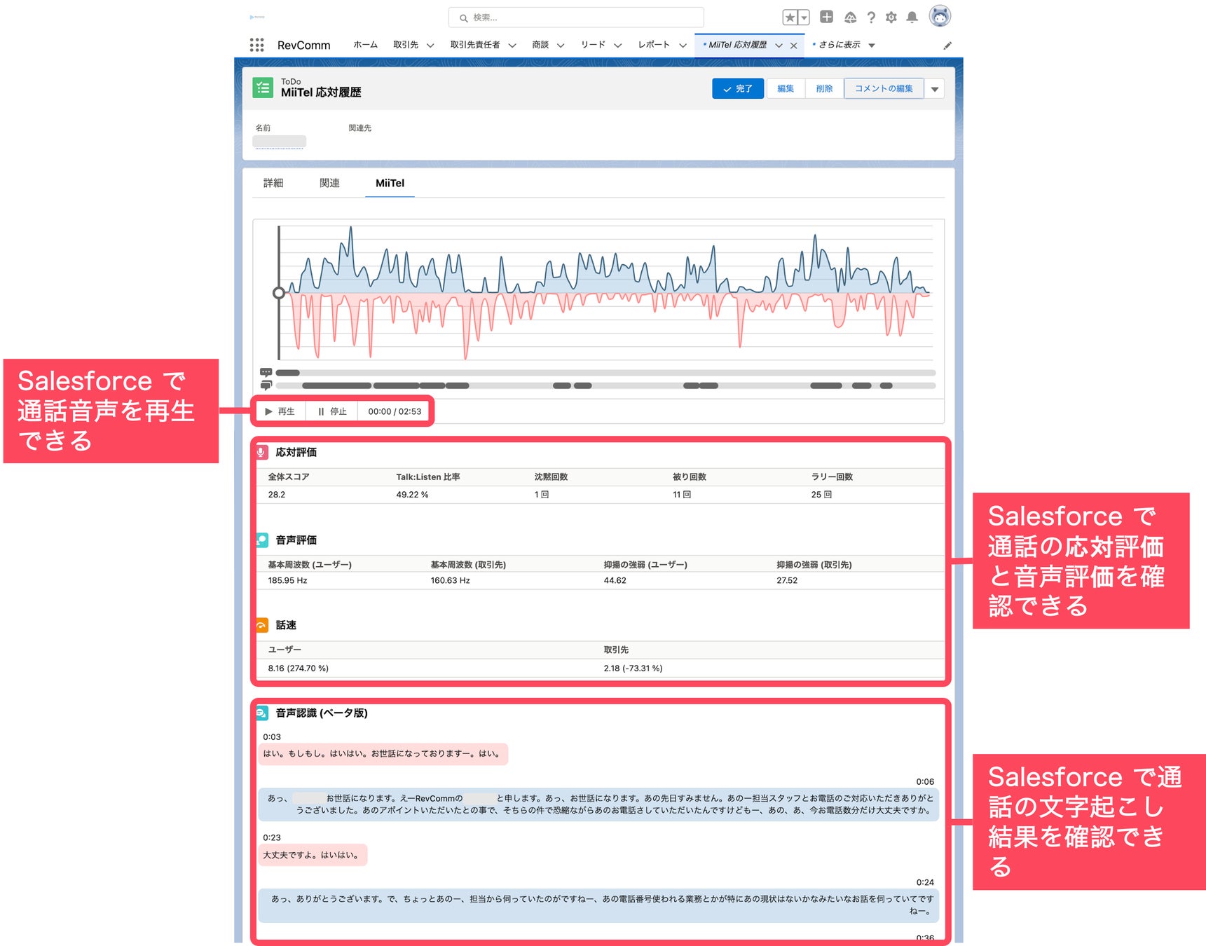 - MiiTel での会話録音をSalesforce 上で再生できます。気になった録音は、すぐにSalesforce上で確認することで、振り返りを迅速に行えるようになります。