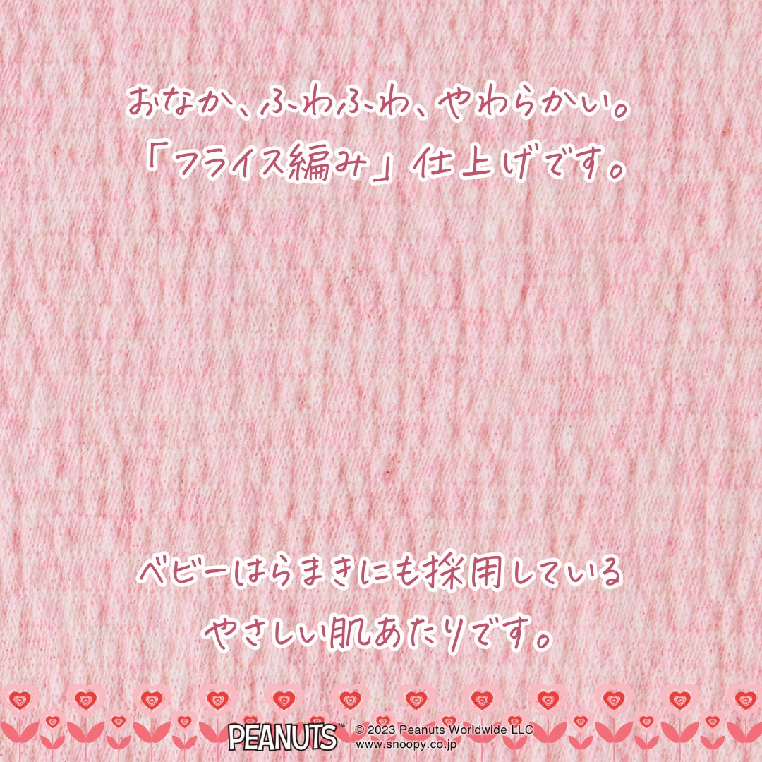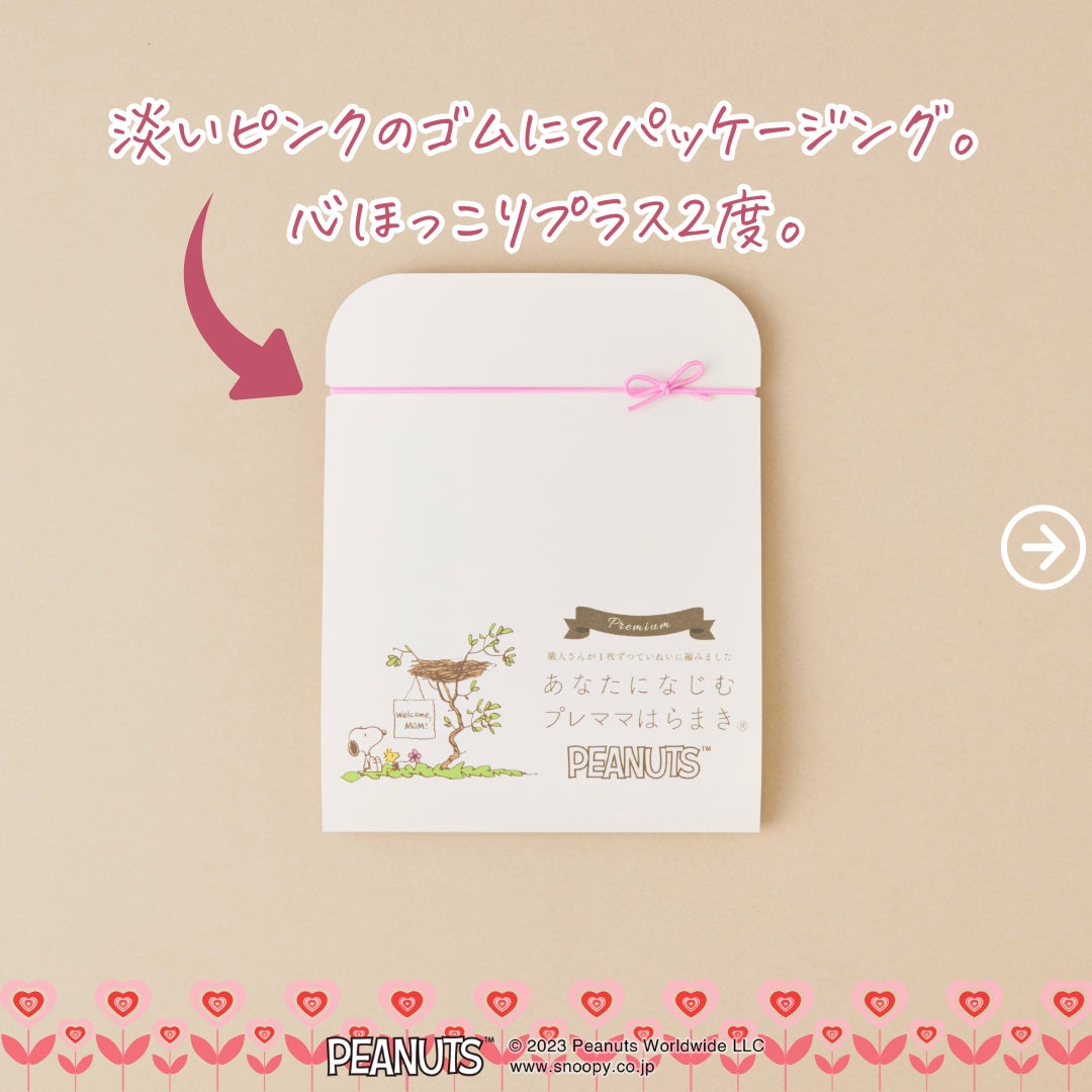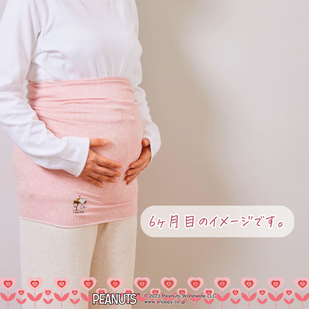 プレママのおなかにやさしい、やわらかふわふわ《フライス編み》。国内生産アナログ編み機こその仕上がり…。プレママのことを考え抜いた【あなたになじむプレママはらまきPEANUTS】、ニューデザイン登場。