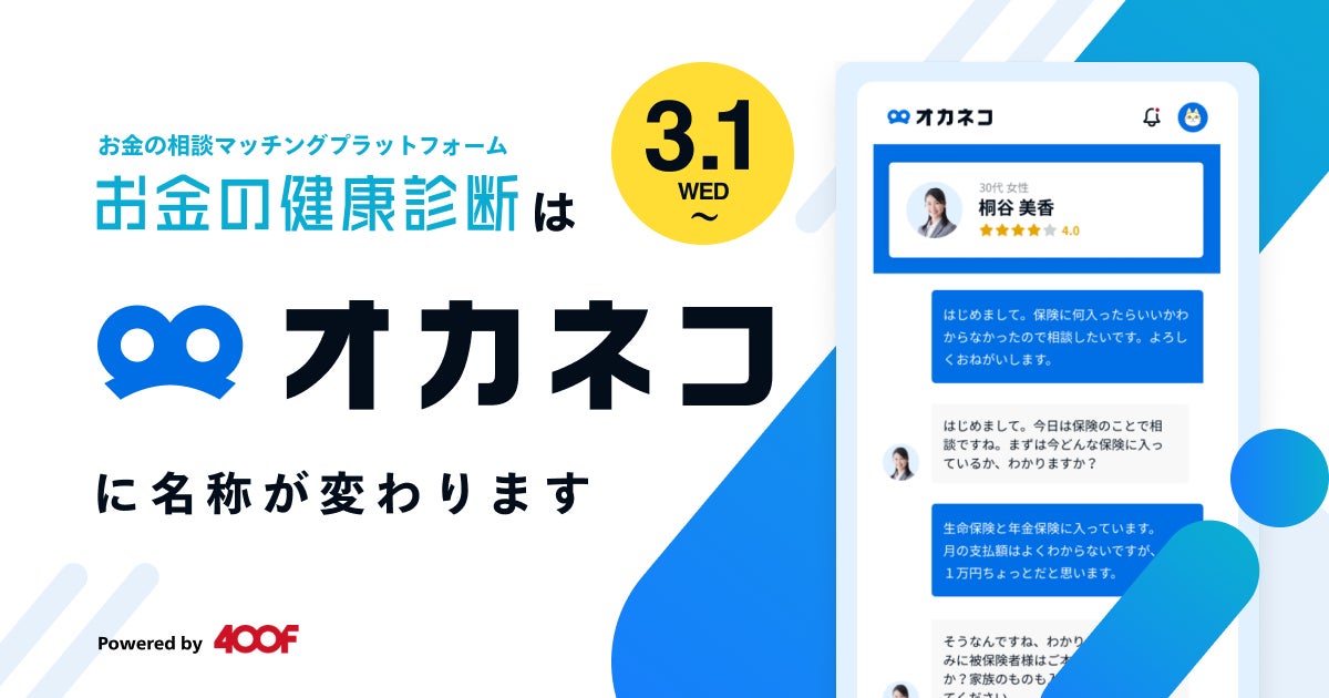 【400F】国内最大級の家計診断・相談サービス『お金の健康診断』が『オカネコ』へサービス名称変更